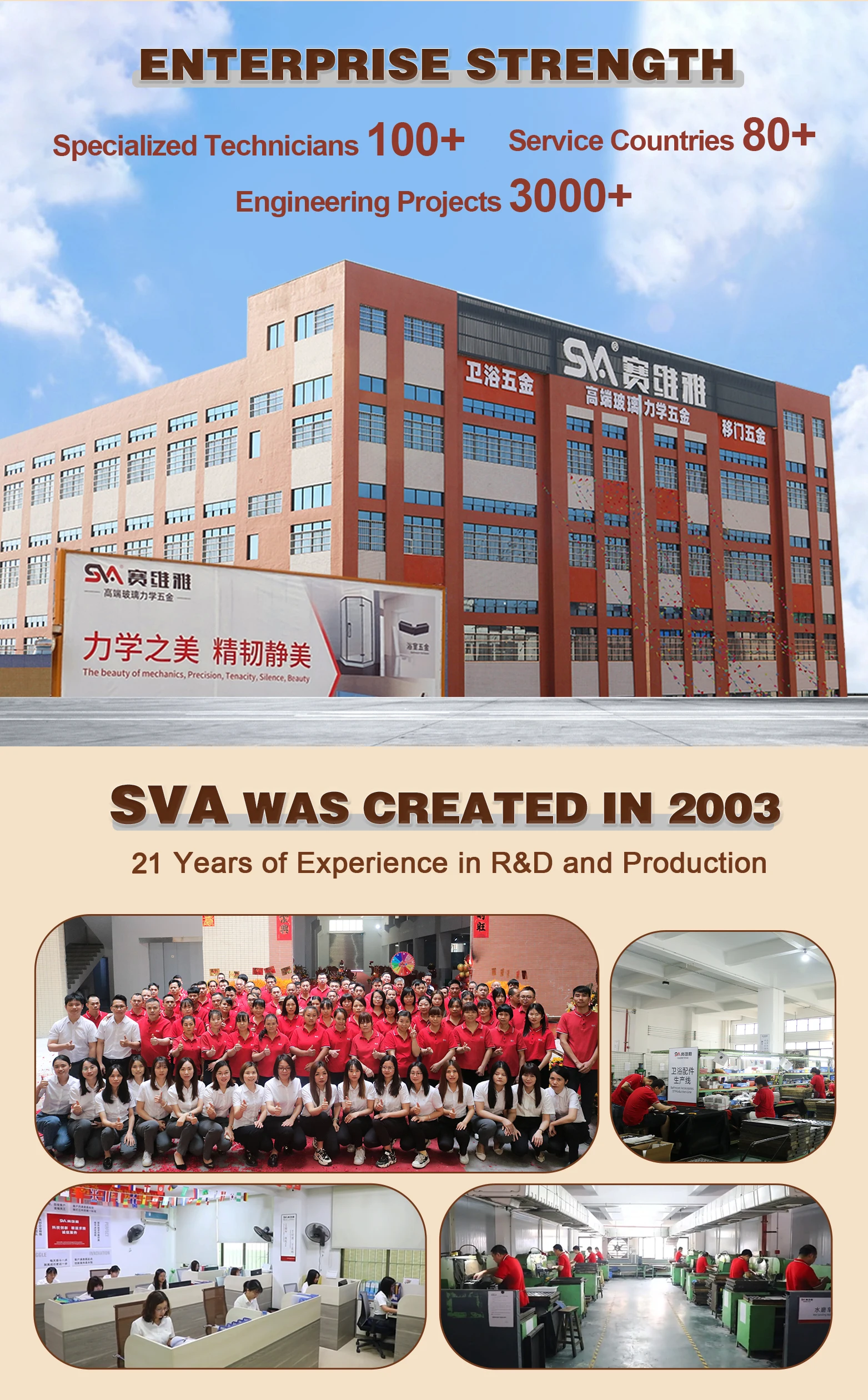 A: SVA is a manufacturer of shower hinge/glass clamp/glass clip/glass door handle/sliding door accessories. It has been 21 years since our company was founded in 2003.