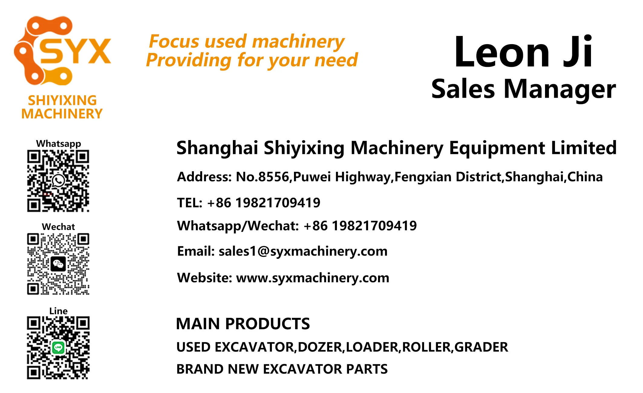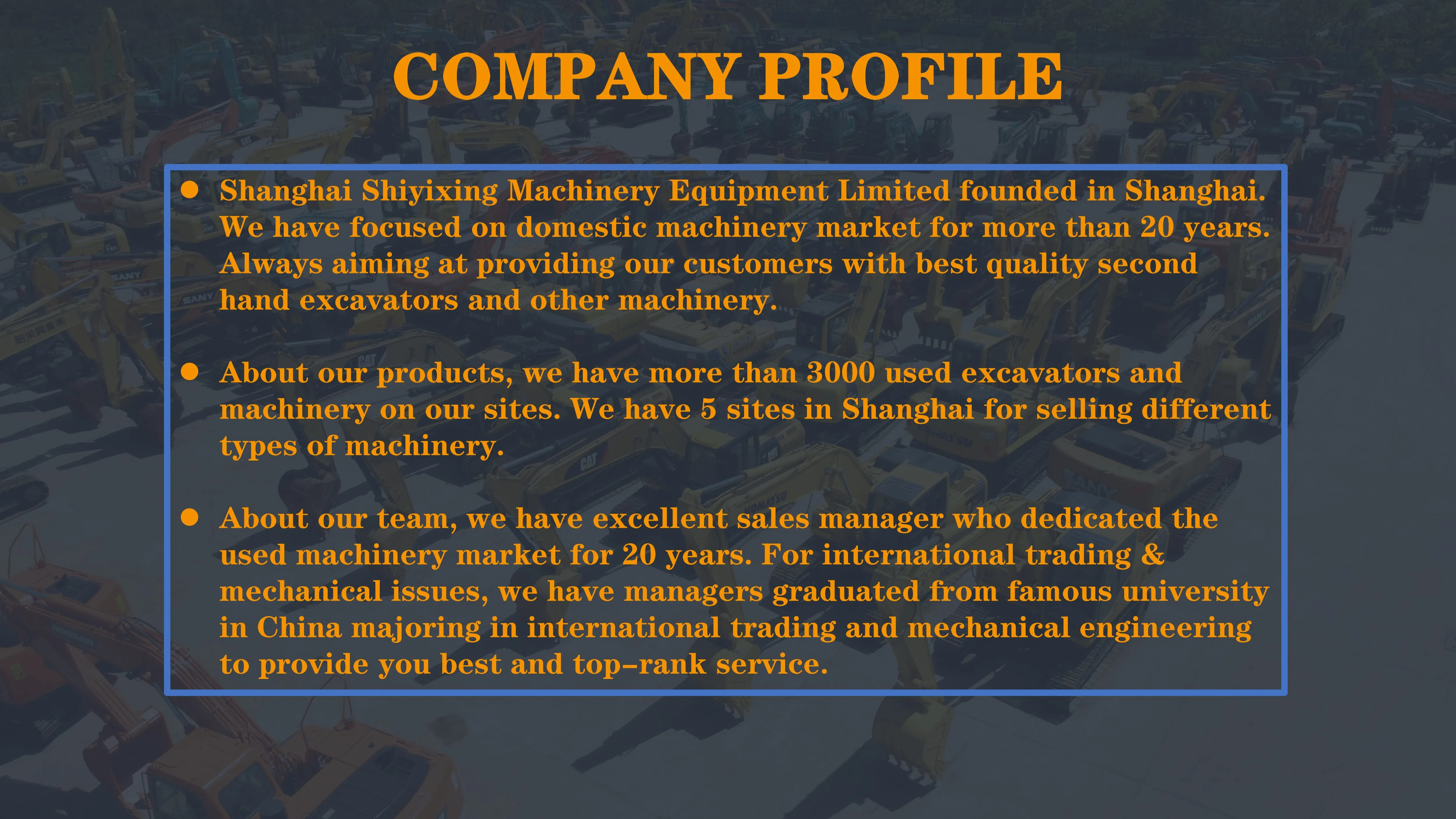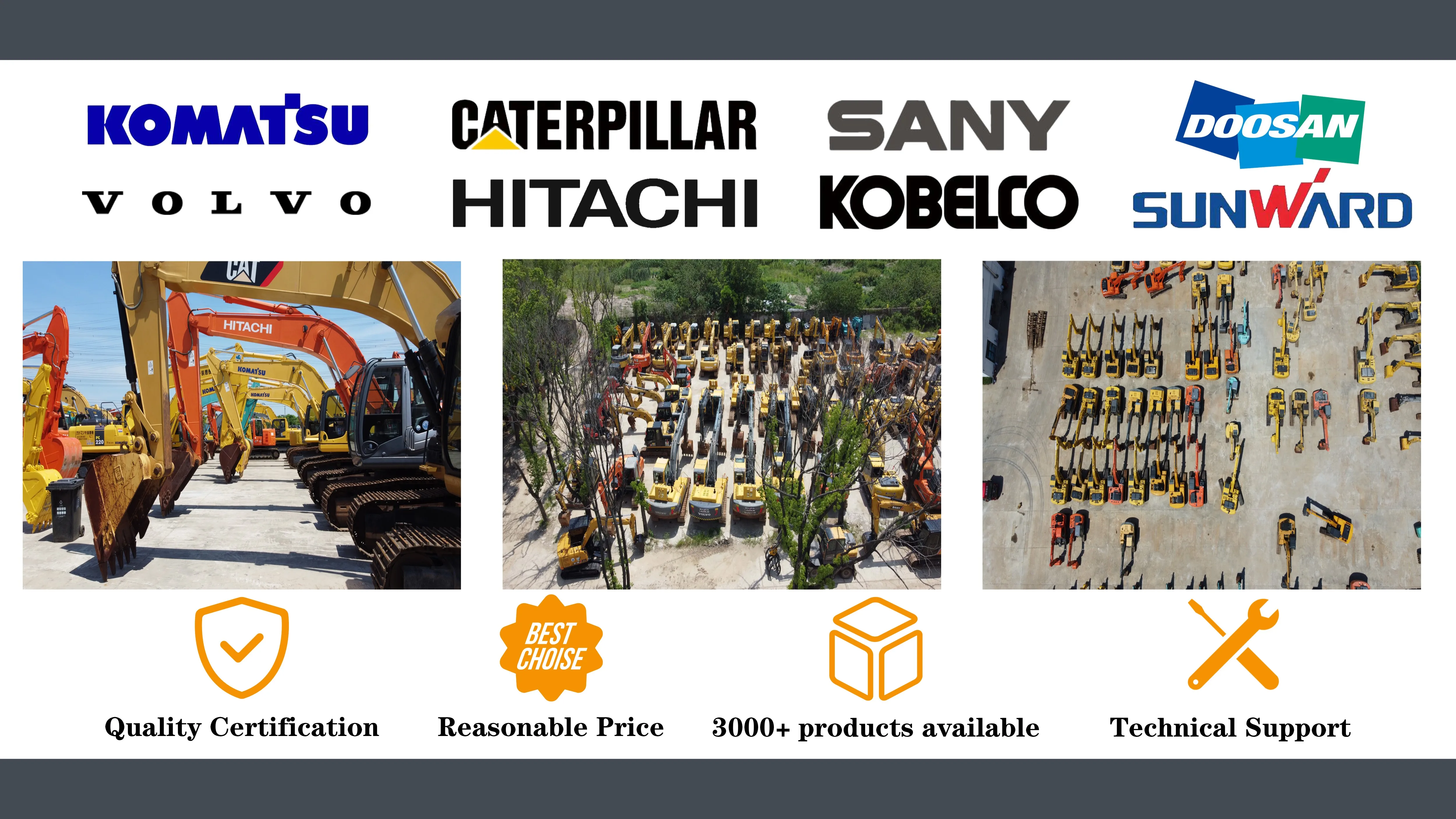 1.We do honest business! Some suppliers may cheat you by sending you a full set of almost new excavator photos but when you received it , it’s another bad condition excavator.Quality is what we care, we won’t let our customers waste money on trash excavators! 2.Price Advantage We have engaged in the used machinery field for many years thus we have very strong bargaining power with our suppliers. Our price for you shall be significantly lower than other used machinery trading company 3.Quality Assured We only sell machinery that have been tested on the spot for many times to ensure that the products have strong performance. Repeat customers are our goal. 4.After-sale Service We will provide high-quality after-sales service for the sold machines, including technical guidance and spare parts distribution. 5. On site reception We sincerely welcome you to visit our site. From the landing of the plane, we will provide you with full reception service and show you around Shanghai.
