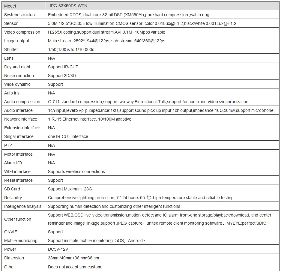 5.0M resolution, low illumination clear and fine images; Support for wired and wireless connections Support 2D/3D noise reduction,digital wide dynamic; Advanced H.265X video compression,Super low rate,high definition quality of image; Professional anti-lightning,conform to GB/T17626.5 and IEC61000-4-5. Support mobile phone monitoring(iOS, Android); Provide web, CMS, provide SDK development Support cloud technology,easy to achieve network penetration,fro in-line and alarm information pushed.
