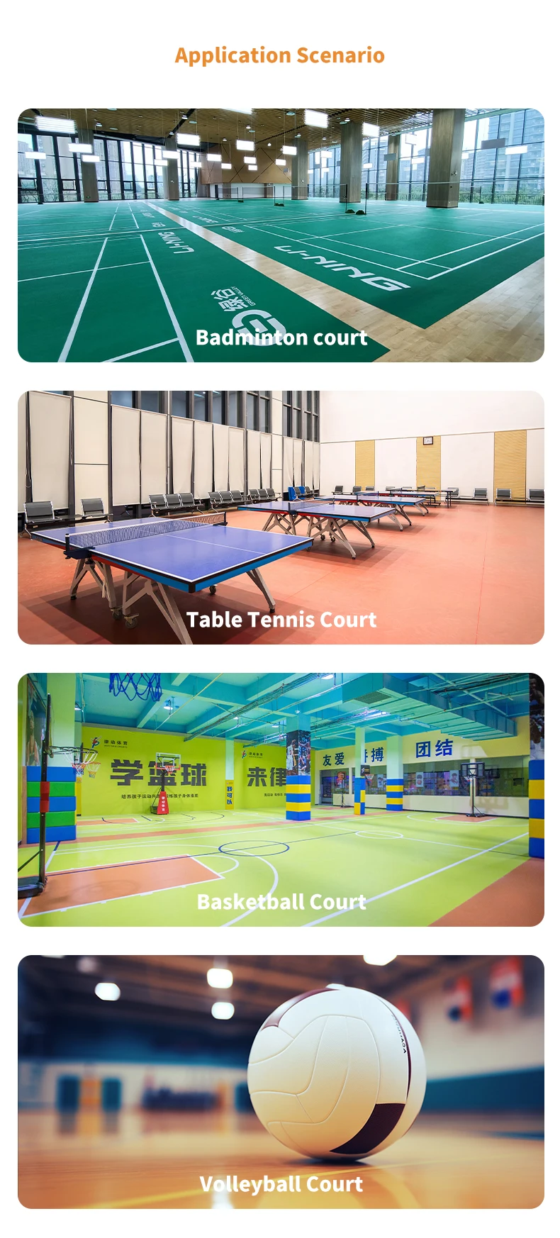 Applications | Badminton court, table tennis court, basketball court, volleyball court , etc. |