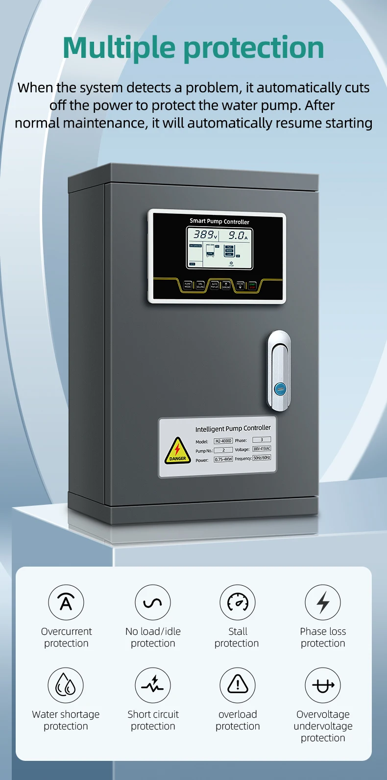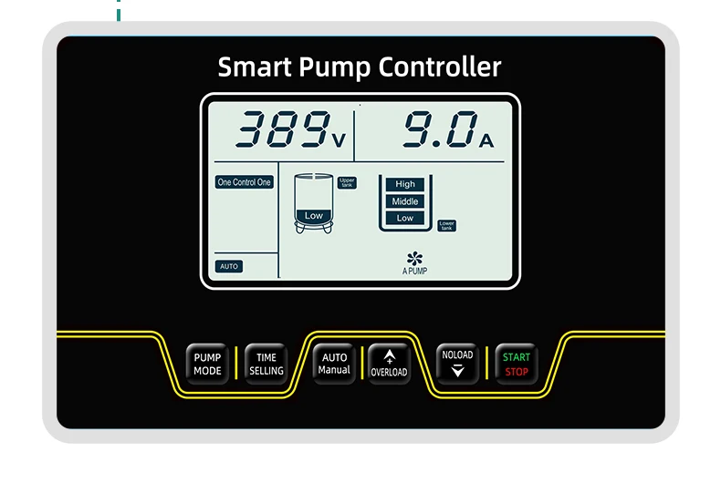 Main Functions | 1,Water level control: level probes or float switch 2,Pressure control: electric contact pressure gauge or pressure switch 3,User interface: a user-friendly interface for configuring settings, monitoring operation, and accessing diagnostic information. 4,Operation mode: automatic/manual starts and stops 5,Fault indication: failure record, latest 10 pump failure reasons display, audio/light alarms. 6,Anti-rust protection, long-term non-use of the pump,15 days to start once for 3 seconds. 7,Setting protection current for motor overload/no-load,no-load delay restart time adjustable. 8,Automatic restart when voltage comes to normal rating after over- voltage/under-voltage protection. 9,Automatic restart after power failure recovery. 10,Automatic restarting pump from dry running, restart time range 0-720 minutes adjustable. 11,Restore factory setting: press both "Overload"and" NO-Load" for 3 seconds. | ||||||