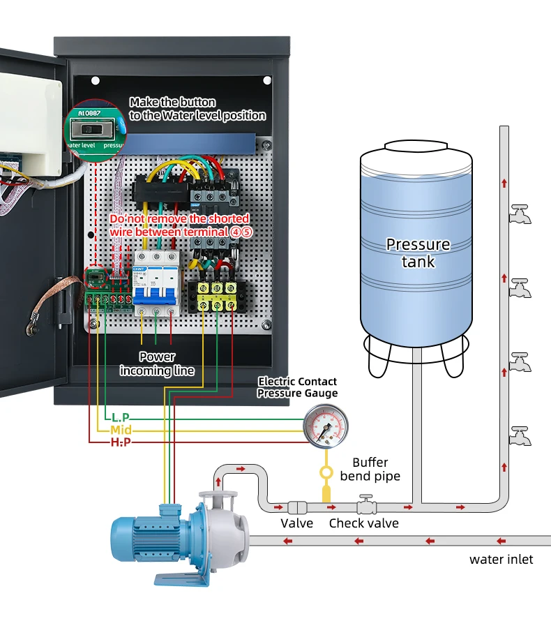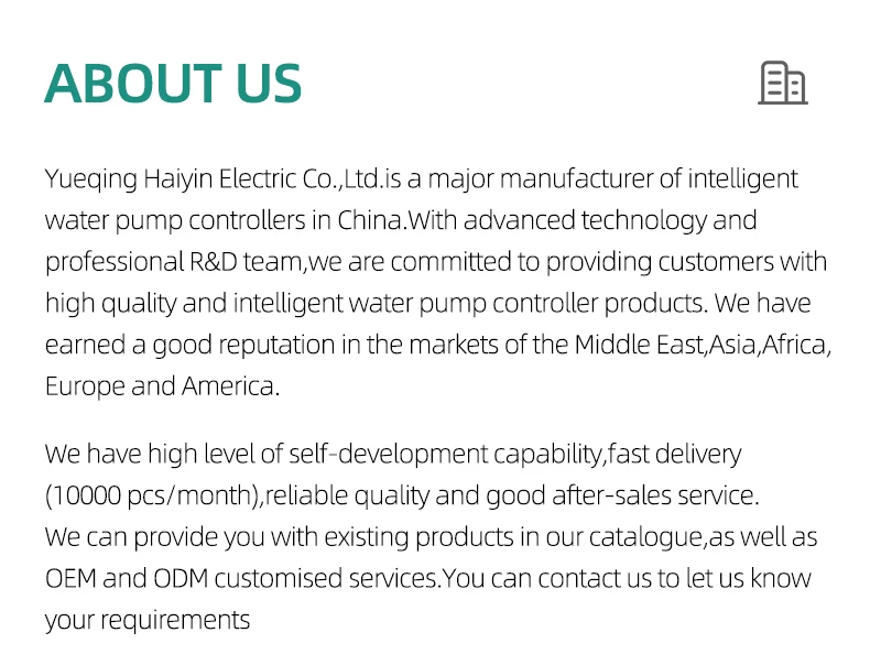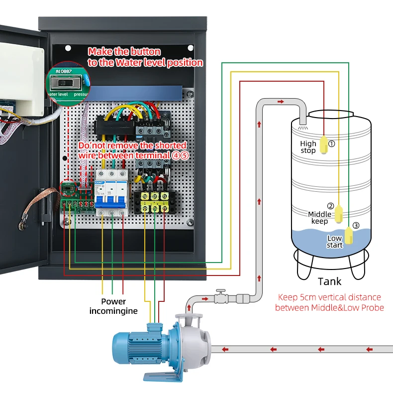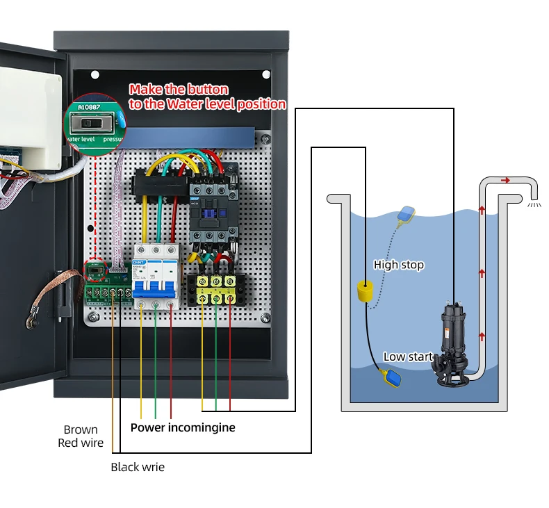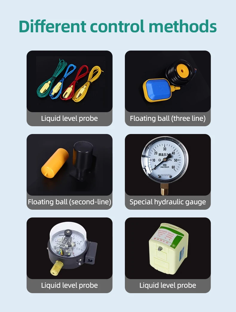 Main Parameters | 1,Rated voltage:AC380V+10%or AC220V+10%(50Hz-60Hz) 2,Rated power:0.75KW-22KW 3,Static consumption power: <3W 4,Water level: High/Middle/Low 5,Water tank: upper tank for water supply, lower tank for drainage 6,Max. control distance:s2000m without strong electric and electromagnetic fields 7,Time setting ON:0-99hours 8,Time setting OFF:0-999 minutes 9,Over-voltage/under-voltage: default AC304V-456V or AC176V-264V (adjustable) 10,Over-voltage/under-voltage trip time: ≤3 seconds 11,Overload/no load trip time:0-600 seconds(ajustable) 12,Phase loss trip time: <2 seconds | ||||||
