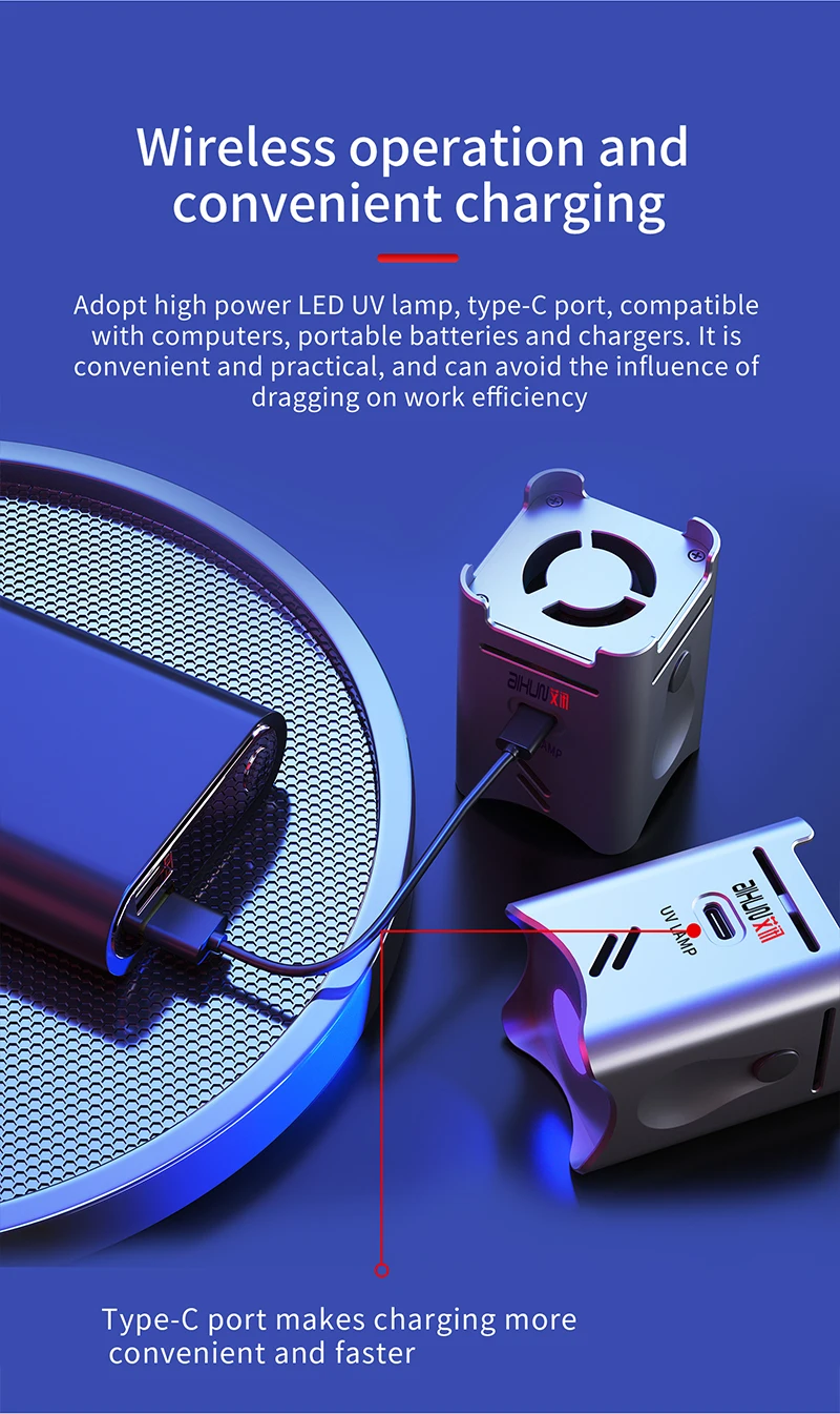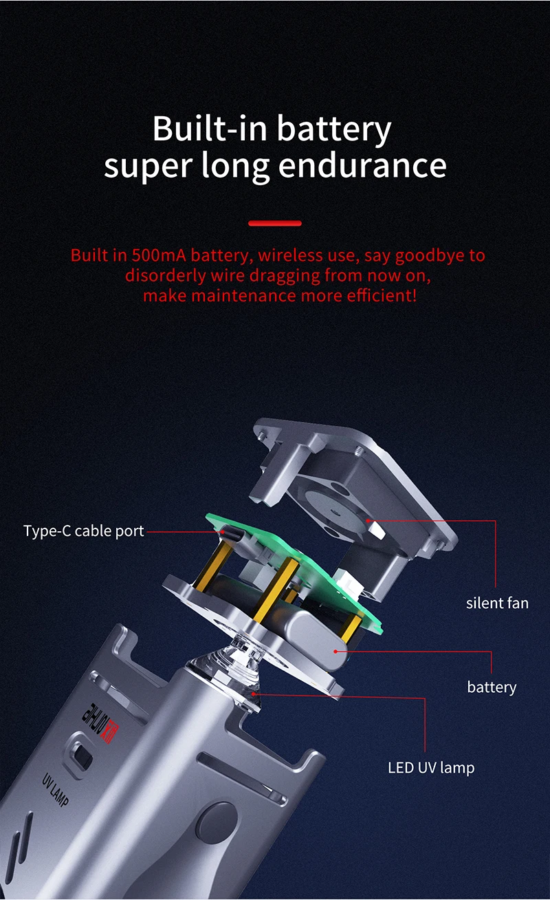 Initiated 2-in-1 design, upper side maintenance cooling fan, bottom side UV lamp, angle sensor automatic control, make maintenance more intelligent and convenient!