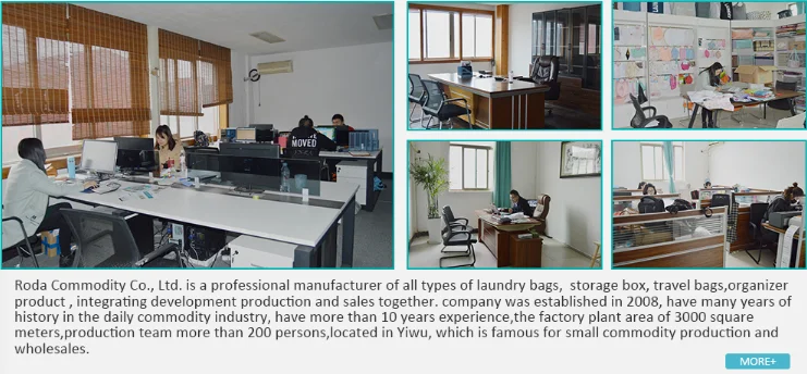 Yiwu roda commodity is established in 2008,which is a professional manufacturer for all kinds of bags,such as laundry bag ,travel organiser bag,cooler bag,toiletry bag,storage bag,shopping bag,gift bag and so on.The factory has 100 staffs,covering 6000 square meters