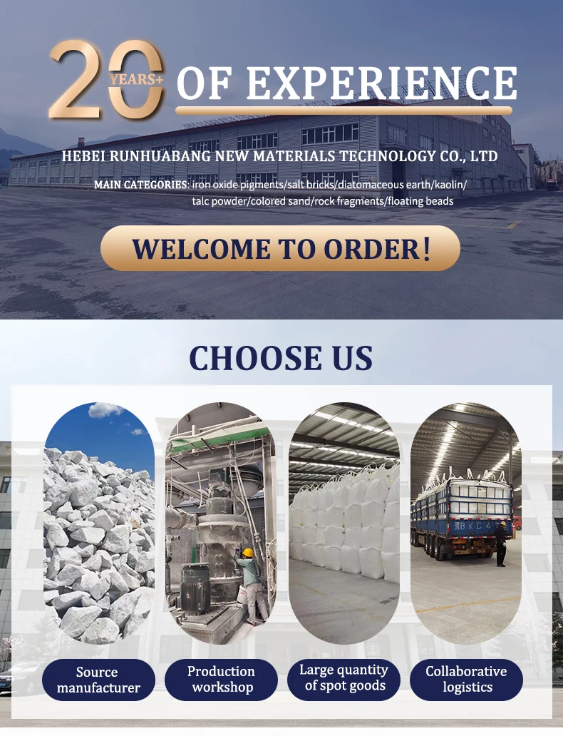 Hebei runhuabang new materials technology co.,ltd is a mineral material enterprise professional in integrating mining, production, processing and sales. We located in Lingshou County, Hebei Province. (lingshou)It is famous for its rich minerals. Also benefits its convenient transportation location: 50 kilometers away from Shijiazhuang(capital of Hebei PRO), 200 kilometers away from Tianjin port. Runhuabang company has strong technical and economic strength: 38 employees with engineer, college degree in processing, testing, sales, finance, warehousing and after-sales one-stop service, we also passed the international quality system certification ISO 9001:2000. Our factory founded in 1986 and our company founded in 2000. It mainly process mineral products.