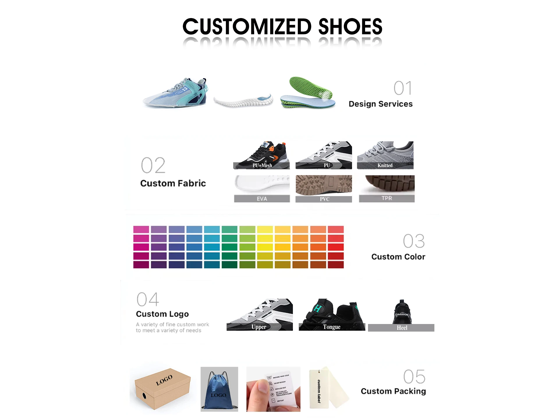 Material | Upper:PU/Mesh/Fly knitting/Kpu/Tpu/Mix Insole:EVA/PVC Outsole:PVC |