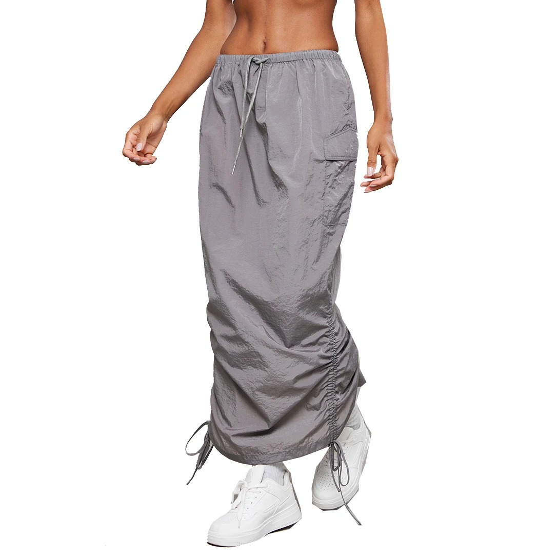 Summer High Tie Waist Patch Pockets Casual Skirt Women Side Drawstring Ruched Back Vented Maxi Skirt $9.99-14.88
