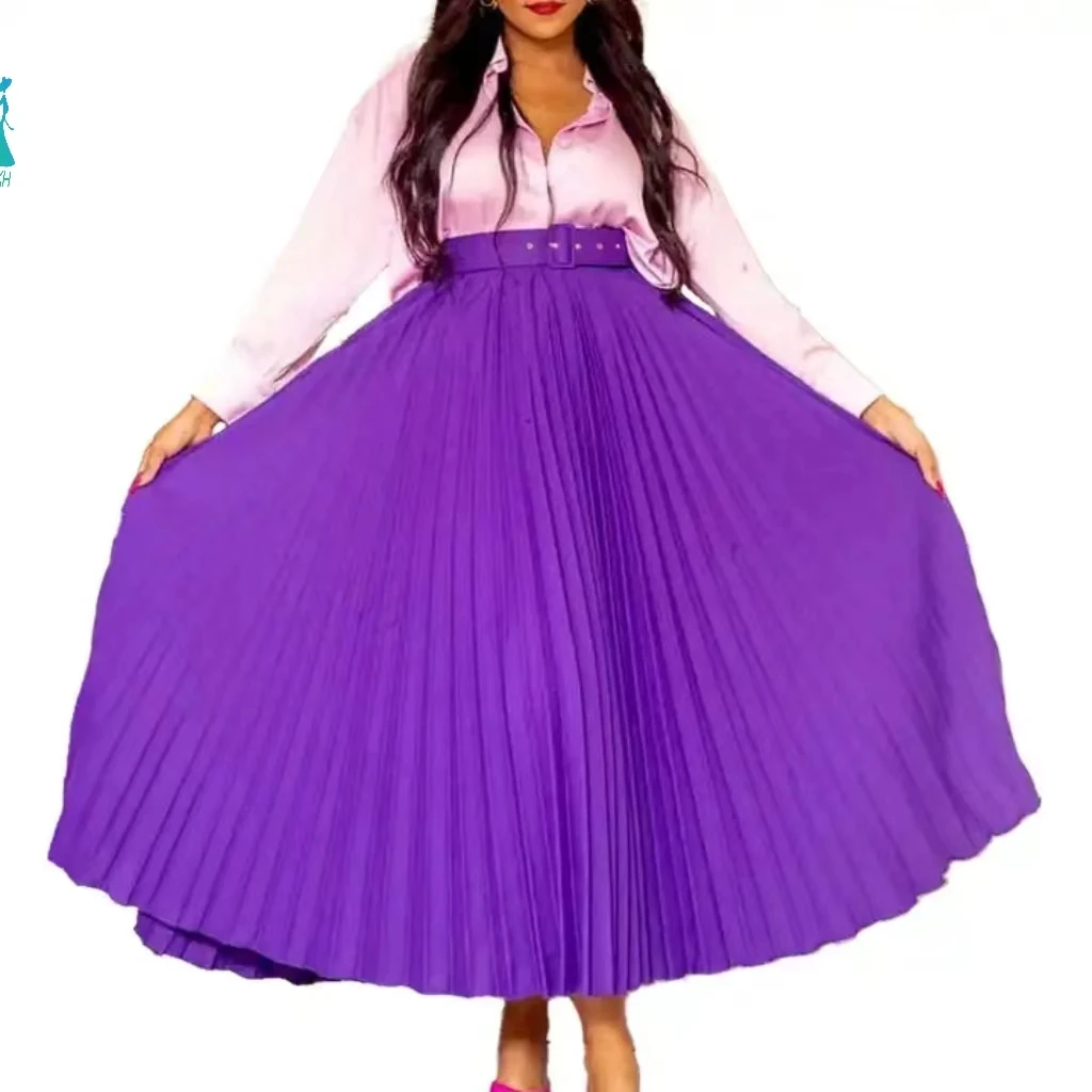 D293P New Design High Waist Large Hem Skirts for Women Pleated Skirts Temperament Ladies Long Skirt With Free Belt $4.00-7.50