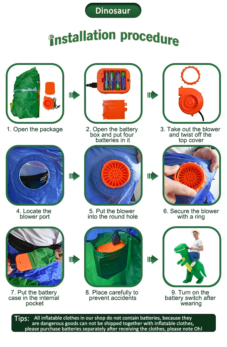 All inflatable clothes in our shop do not contain batteries, because they are dangerous goods can not be shipped together with inflatable clothes, please purchase batteries separately after receiving the clothes, please note Oh!