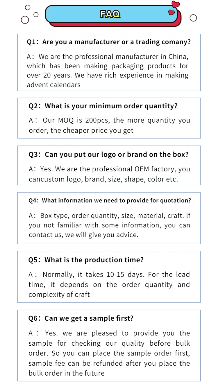 We have advanced equipment and experienced staffs, so we can provide you various empty advent calendar,12 days 24days 25 days Christmas advent calendar boxes, in a short run, with high quality and best price.