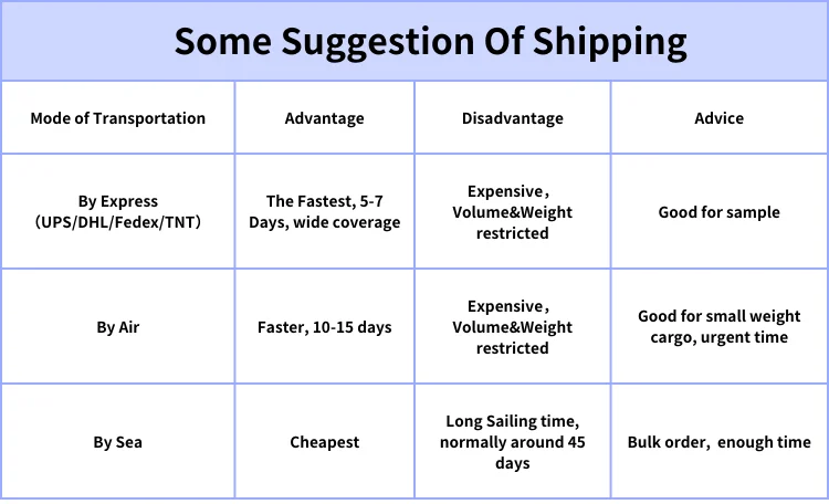 We have long-term cooperation with the shipping agent, like DHL, UPS, FedEx, TNT, shipping by air, shipping by sea, etc. We can a good rate at the freight, then can help you to save delivery cost. We are pleased to help to arrange shipment for you.
