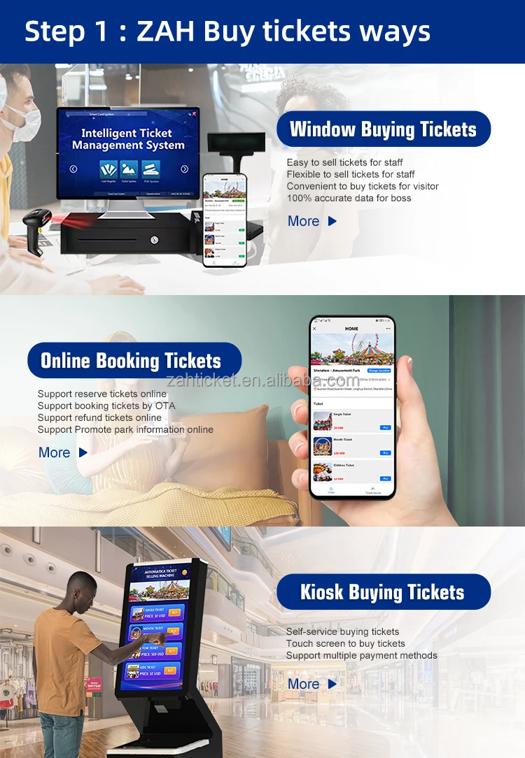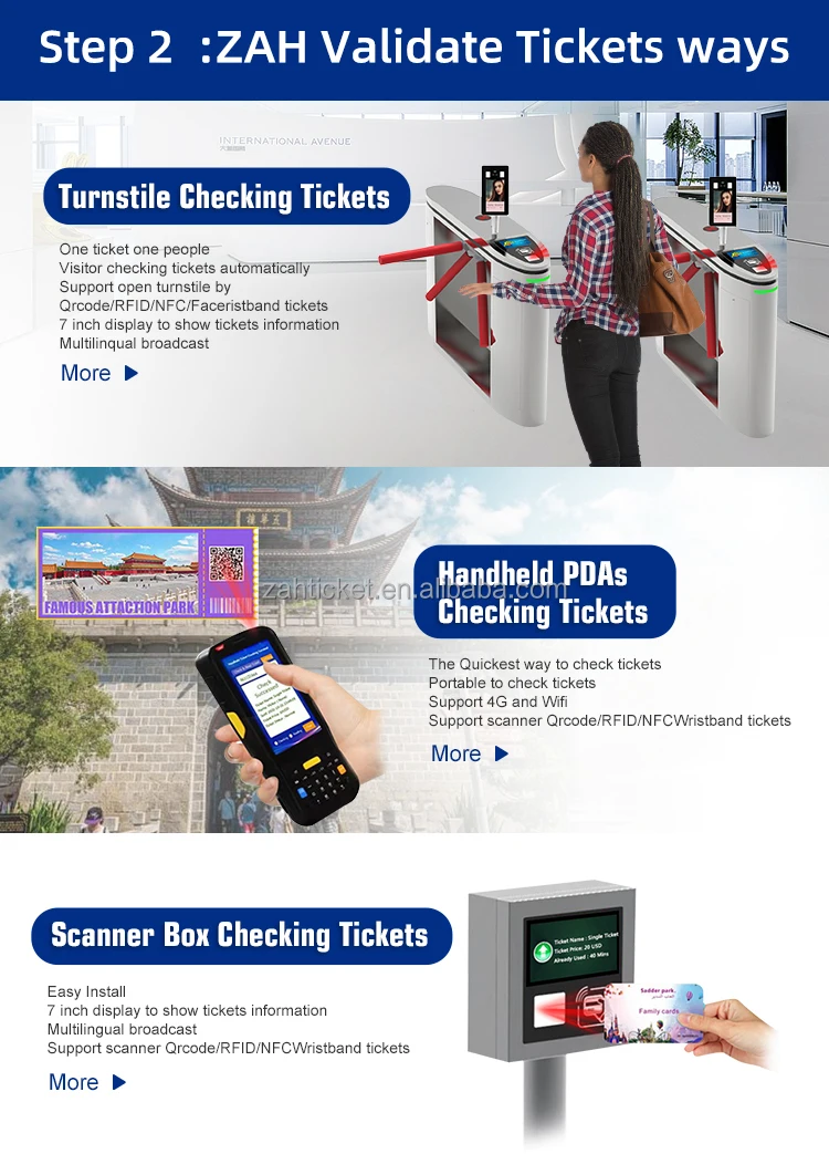 And the tickets are available as RFID cards/barcodes tickets /Qr code tickets /wristbands tickets/face tickets/ E-tickets .... and more! Different tickets can be configured according to different access conditions, including by date, frequency, amount, time, or mixed configuration. The ZAH ticketing system platform is easy to confiure and use, and stable, suitable for most parks and activities. Most importantly. the ZAH ticketing system platform creates 100% accurate financial reports byrecording all information (from ticket sales to ticket verification) through software, allowingbosses/managers to know the financial reportsAt any time or place, prevent visitors from entering your place without purchasing a ticket.