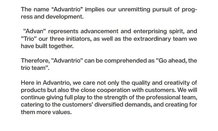 The name "ADVANTRIO" implies our unremitting pursuit of progress and development. "Advan" represents advancement and enterprising spirit, and "Trio" our three initiators, as well as the extraordinary team we have built together. Therefore, "Advantrio" can be comprehended as "Go ahead, the trio team".