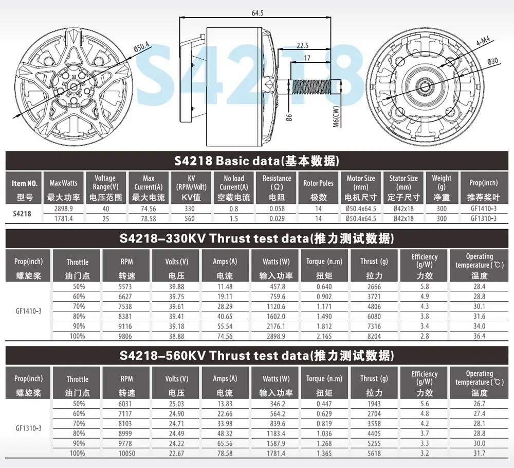 S4218 | 2898.9w | 40v | 14 | φ50.4×64.5 | 330kv | φ42×18 | GF1410-3 |