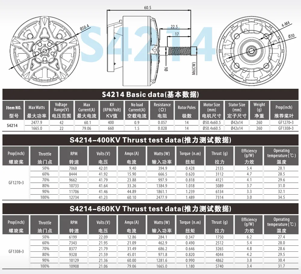 S4214 | 1665W | 22V | 14 | φ50.4×60.5 | 660kv | φ42×14 | GF1308-3 |