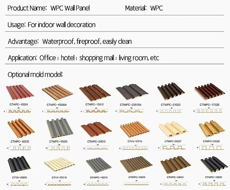 WPC Wall Panel is a new product series for interior decoration . Wood plastic composite hollow materials are applied to this product series in order to provide water-proofing, low maintenance, sound insulation, insect resistance and healthy concepts.Another feature of this product is quick installation and this can lead to less time and less labor cost. Our new product is suitable for the decoration in living room, hotels, shops, kitchens, offices and other living area.many design, 3-8flute.size customized.