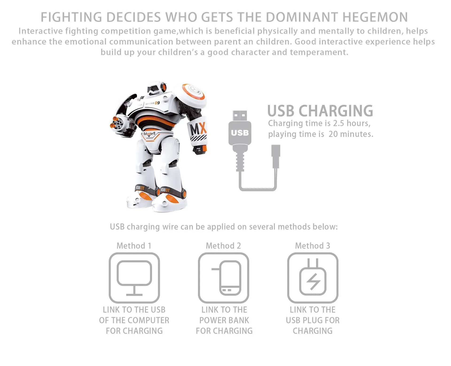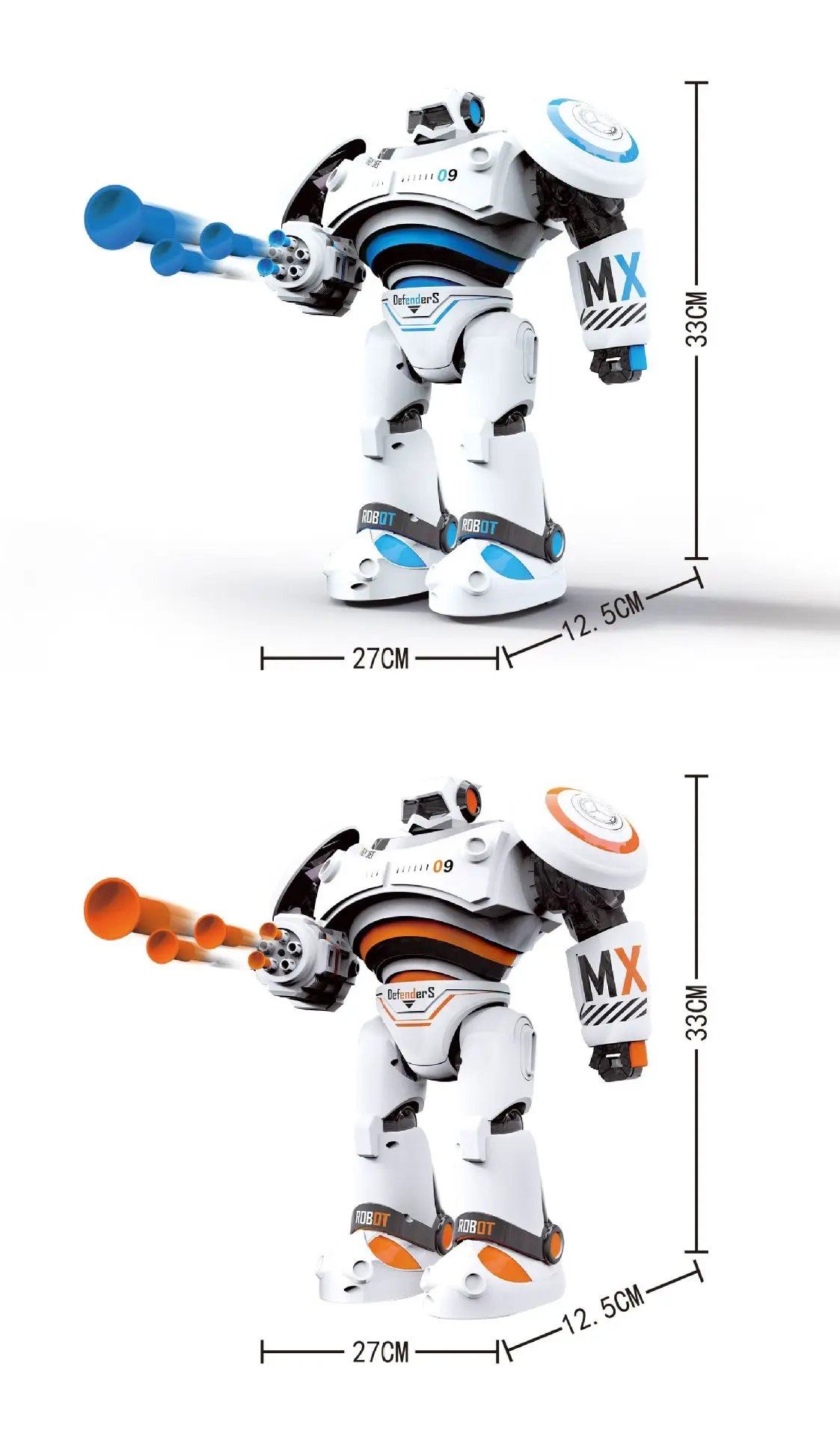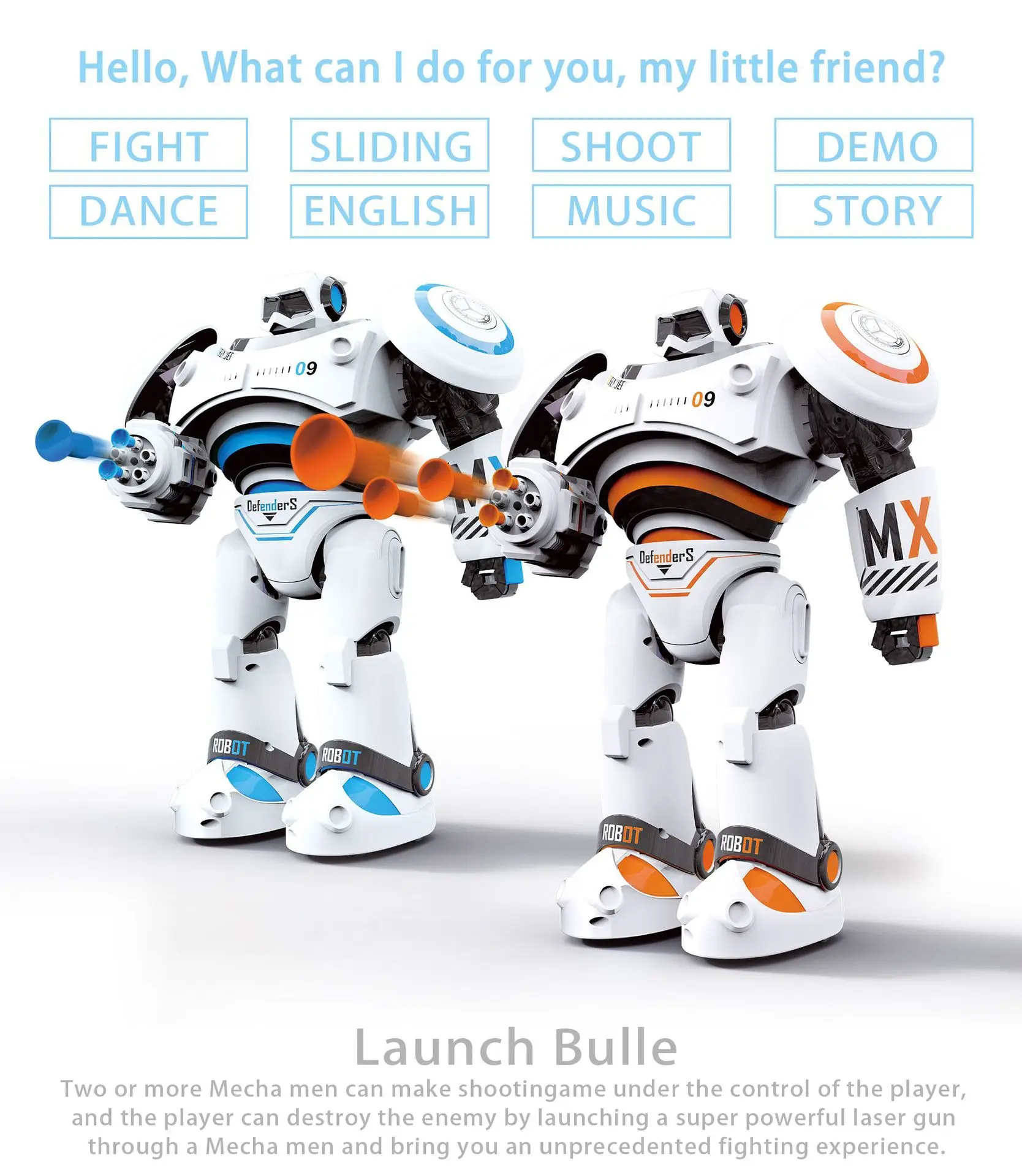 Every joint of the robot is flexibly designed, and the action is more agile to meet the full range of precise control. 2. The robot has different movement modes, walking movement; sliding movement and fast and slow movement mode, players can change according to different environments, and make correct combat operations instructions.