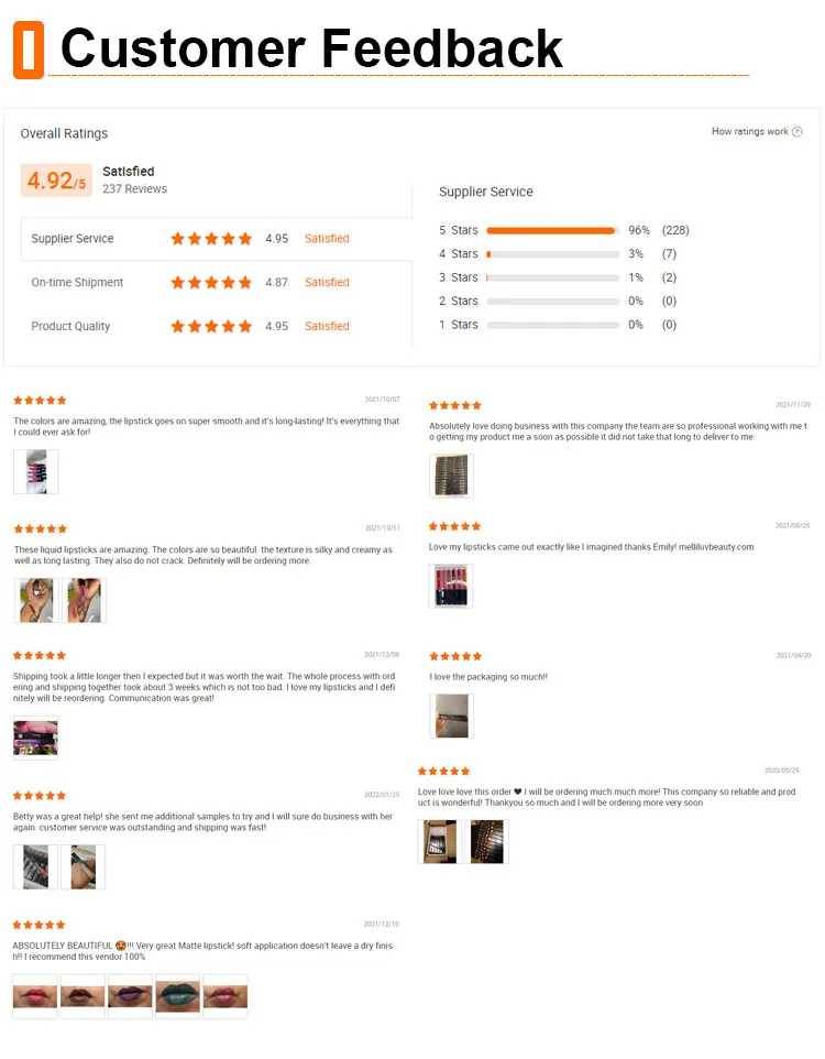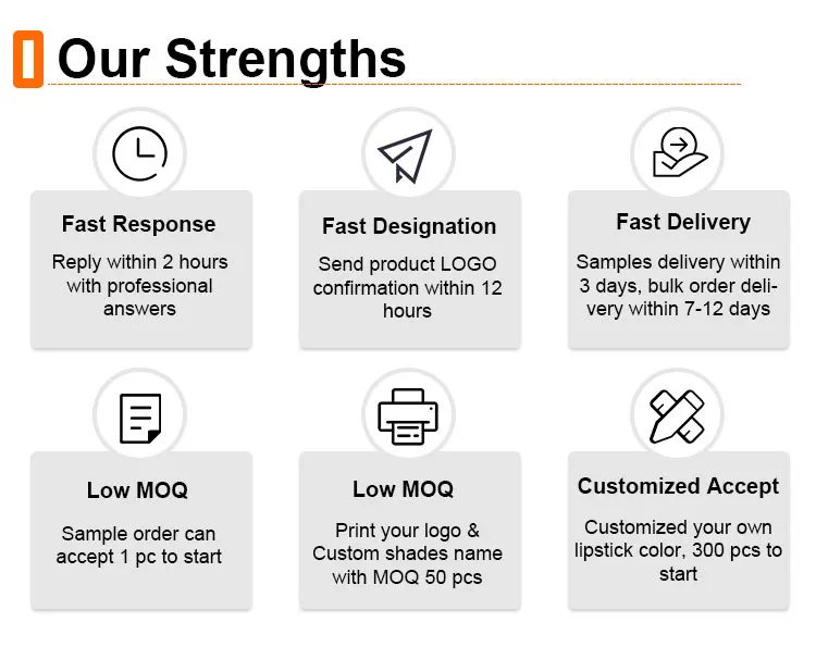 Advantages | 1. Alibaba Verified Gold Supplier 2. High quality ingredients and strict QC 3. Professional team of R&D and 5-star service 4.Factory price: Offer EXW price, FOB price and CIF price, or according to client's requirements 5. Large production capacity and fast delivery, the delivery time is 3-5 business days 6:Accept customized cosmetics product and package as your sample and file. |