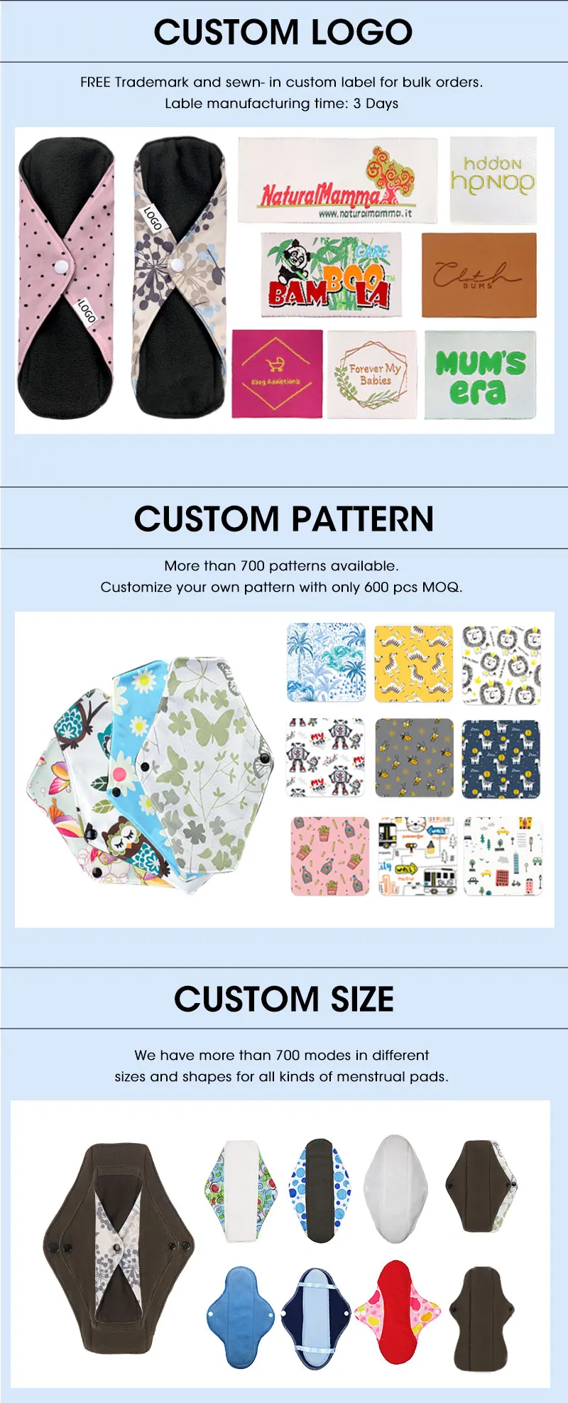 A: Menstrual pad,baby cloth diaper,baby swimming diaper, training pans, adult diaper , reusable nursing pads , washable menstrual,pads ,wet bag,changing mat,baby bibs,baby swaddle,mummy bag,etc.