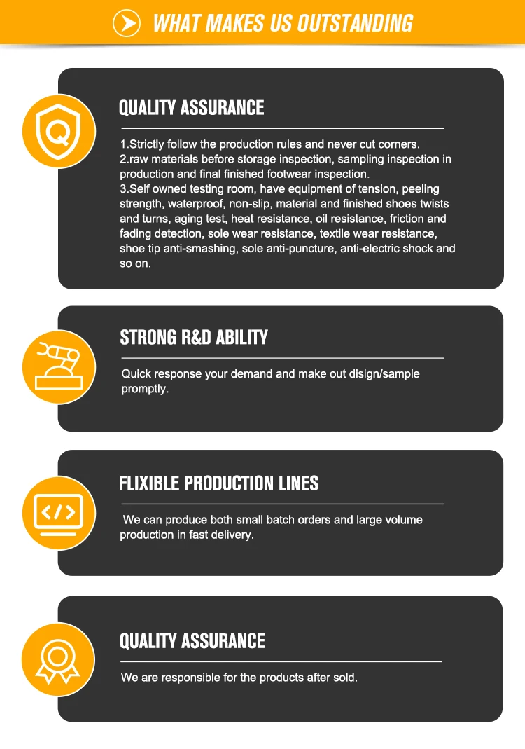 2. how can we guarantee quality?We believe that good quality is based on excellent materials and rigorous manufacturing processes. So we inspect all the raw materials, only materials that pass the inspection can be stored in ourwarehouse. Strictly follow the production specifications. Only components that pass the inspection can flow to the next production process. Only passed final inspection shoes could be storied in our finished product warehouse.