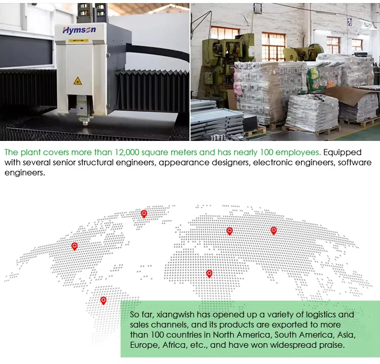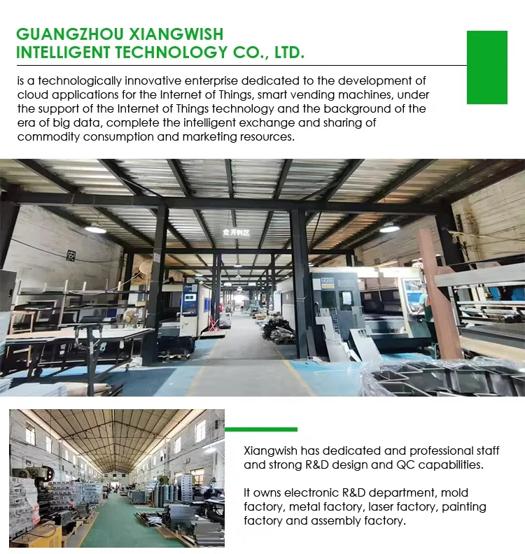 Guangzhou xiangwish Intelligent Technology Co., Ltd. is a technologically innovative enterprise dedicated to the development of cloud applications for the Internet of Things, smart vending machines, under the support of the Internet of Things technology and the background of the era of big data, complete the intelligent exchange and sharing of commodity consumption and marketing resources. Xiangwish has dedicated and professional staff and strong R&D design and QC capabilities. It owns electronic R&D , mold factory, metal factory, laser factory, painting factory and assembly factory. It has a strong integrated management system for R&D, production, manufacturing and sales, and has , CE, FCC, ROHS and ISO9001 quality management systems and certifications. The plant covers more than 12,000 square meters and has nearly 100 employees. Equipped with several senior structural engineers, appearance designers, electronic engineers, software engineers. So far, xiangwish has opened up a variety of logistics and sales channels, and its products are exported to more than 100 countries in North America, South America, Asia, Europe, Africa, etc., and have won widespread praise. xiangwish is striving to be the leader of the industry, and welcomes you to join the agent, and cooperate with trade exchanges and customization. |
