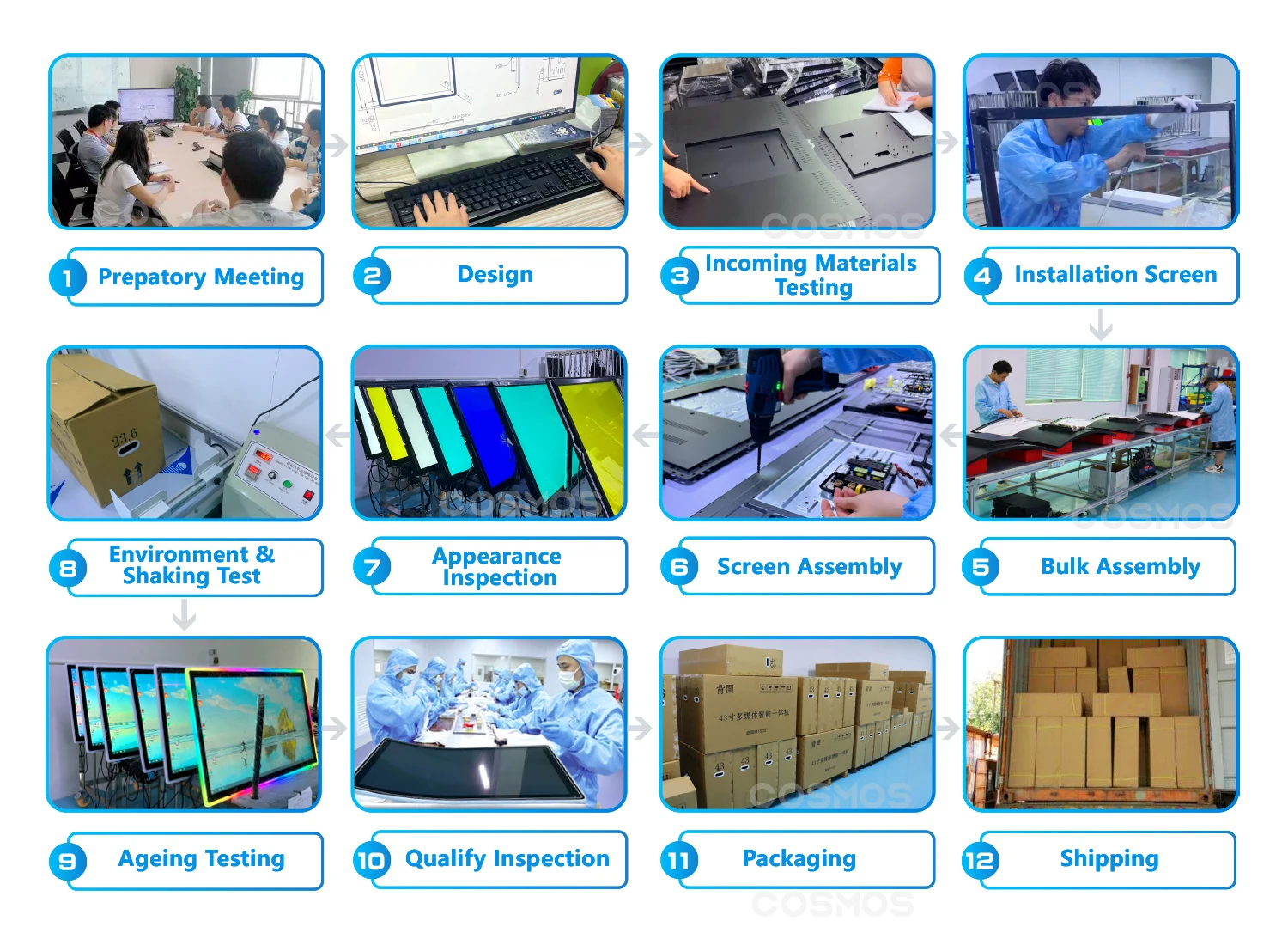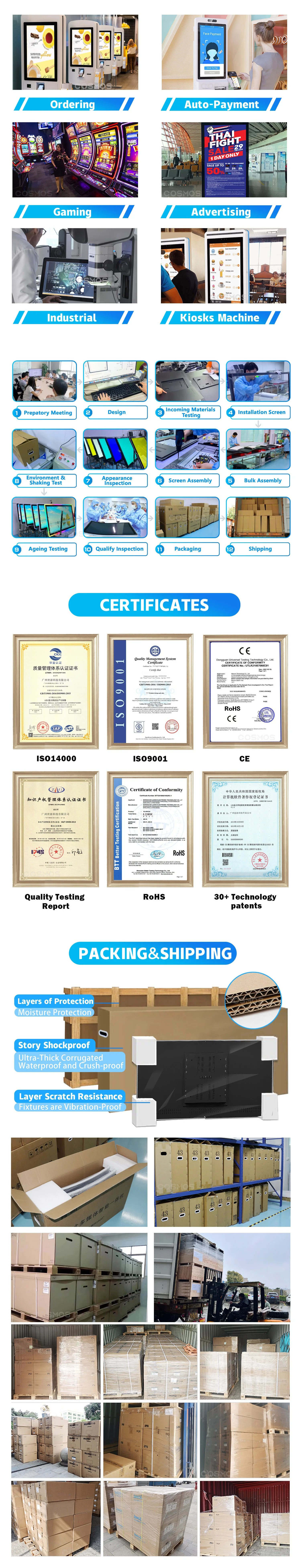A6: Our touch screen had passed ISO9001/CE/ROHS quality control system. All the monitor pass double times strict QC inspection before the packing. In particular, export products need to complete 72-hour aging test to ensure no problems before shipment.