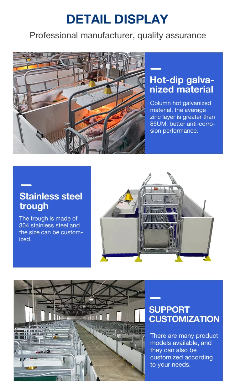 describe | The fence body is made of hot-dip galvanized material with an average zinc layer greater than 85UM, providing a stronger .Corrosion resistance. The fence is made of 500 * 35MM herringbone reinforced pvc board, which is flame retardant overall Sow floor adopts Mitsubishi rigid hot-dip galvanized floor, piglet floor adopts 500*600 or 600 * 600PP .Flame retardant flooring, customizable. Food trough made of 304 stainless steel material, size can be Custom. Drinking fountains for sows and piglets are made of 304 stainless steel. Piglet's drink bowl.All made of 304 stainless steel material. |