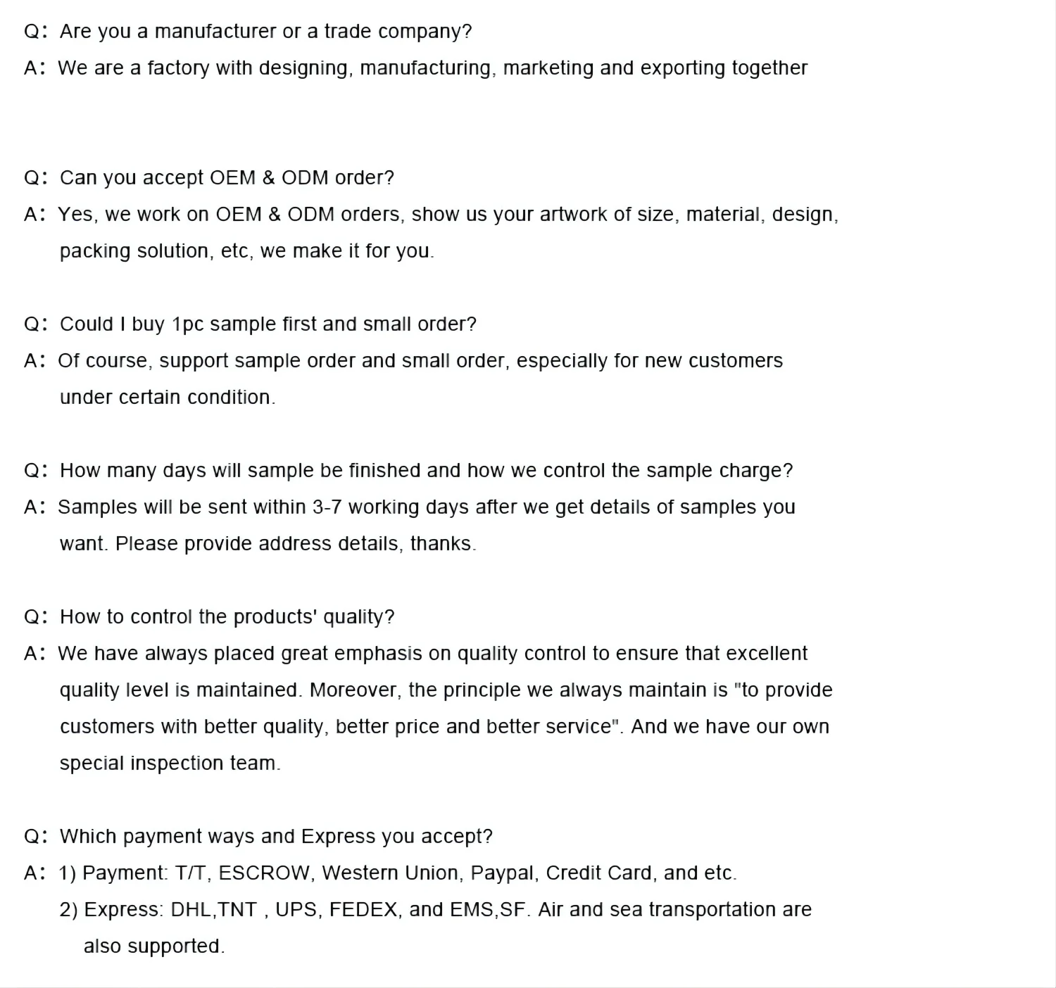 Our company is major in providing the most comprehensive information and service, which make the clients more satisfided. Pay attention to customers, listen to our customers, to improve customer's satisfaction are our goal. You can order directly from the website or send the order details, we provide OEM and ODM services. Our sales assistant will reply your email immediately, welcome to our factory!