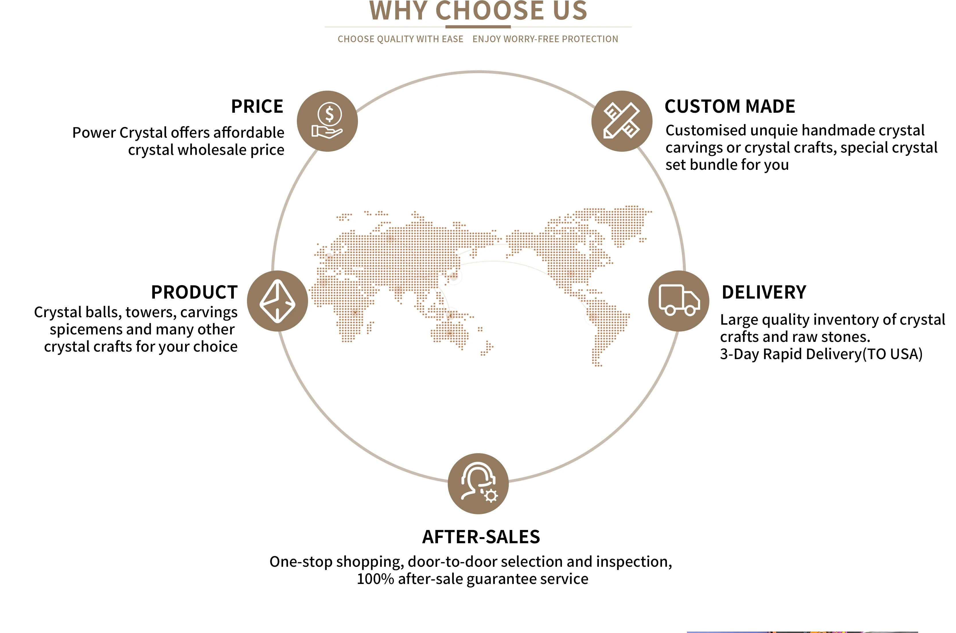 Q1 : WHY CHOOSE US? A1: Power Crystal provide different kinds of crystal products with wholesale price & high quality. And we also provide high