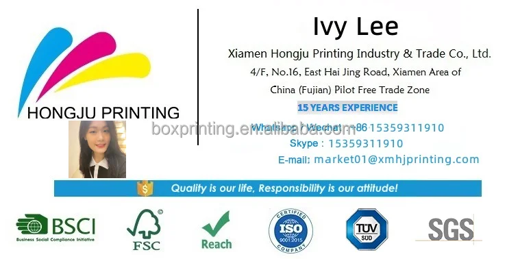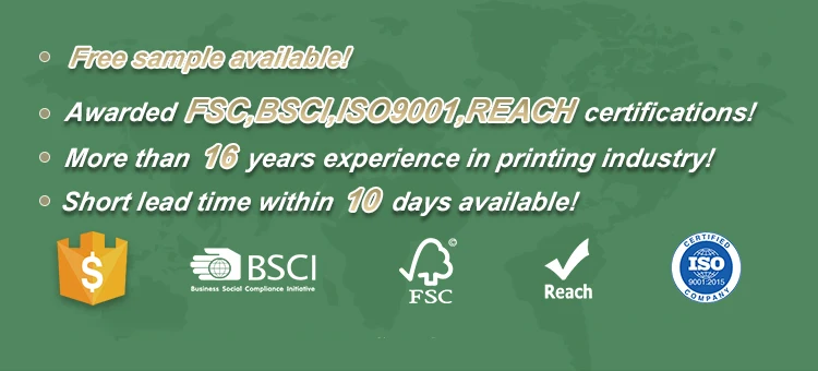 We have 2 sets 6+2 color UV printing machines, 2 sets stamping machines, 2 sets lamination machines, 3sets box molding machines and over 5 sets gluing machines. Our daily output can reach 50,000pcs, monthly output 1,500,000pcs Owned Certificate: FSC,BSCI,ISO9001,REACH.