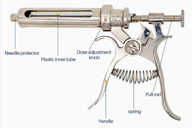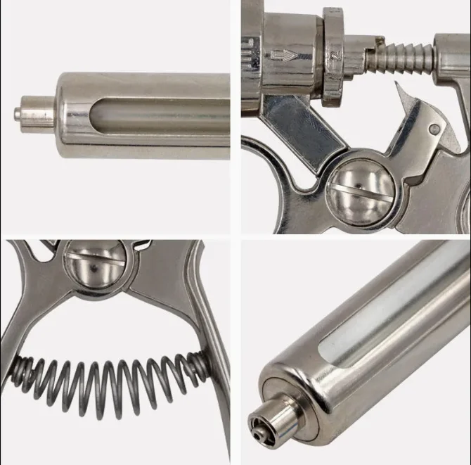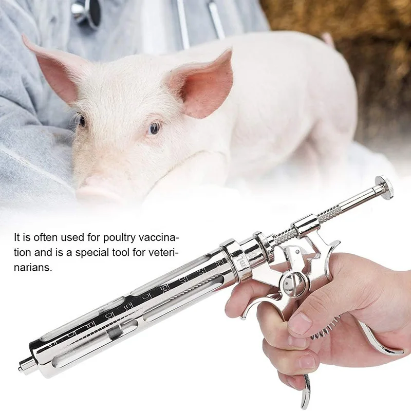 1. It is equipped with measuring clip device, five gears can be adjusted, measuring more accurately and injecting more conveniently. 2. 10ml adjustable continuous syringe, made of high quality stainless steel, durable, wear-resistant. 3. The dosage can be adjusted by pressing down the dosage adjustment button and pushing forward. 4. It can hold10ml liquid medicine at one time. It is equipped with stainless steel tie rod. It is not rusty and easy to operate. 5. This syringe is suitable for pigs, cattle, sheep, etc. It is often used for poultry vaccination and is a special tool for veterinarians.