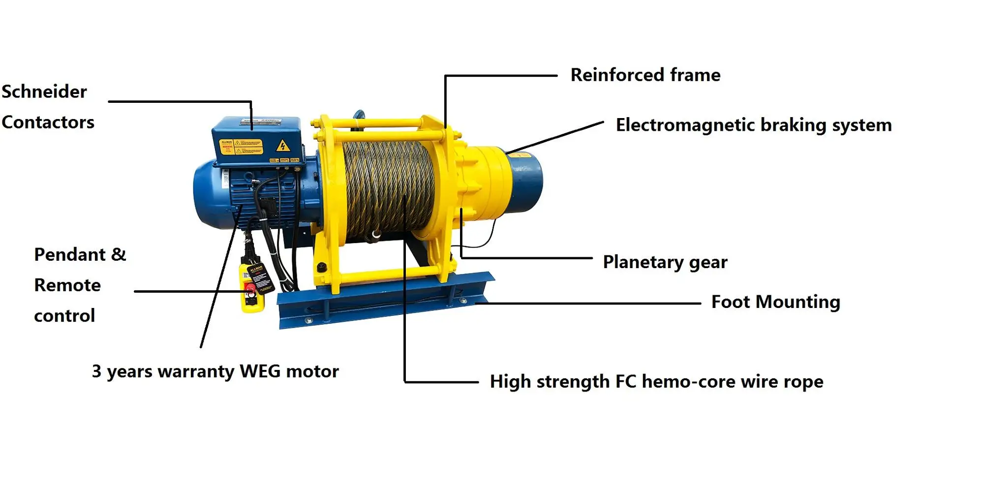 Foot mounting | A strong base which is made by steel for foot mounting on ground, concrete or other places. The base can enhance the connecting strength of winch structure. With handles on both sides for easily carrying and moving. |