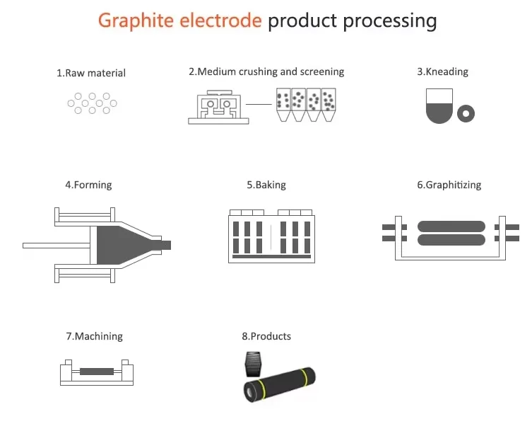 Graphite electrode, mainly petroleum coke, needle coke as raw material, coal pitch as binder, calcination,ingredients,kneading,molding, baking and graphitization, machining and made, which is released in electric arc furnace in the form of arc conductor of electricity to heat melting furnace charge, with low resistivity, good conductivity, low ash, uniform and compact structure, good oxidation resistance, high mechanical strength, etc.