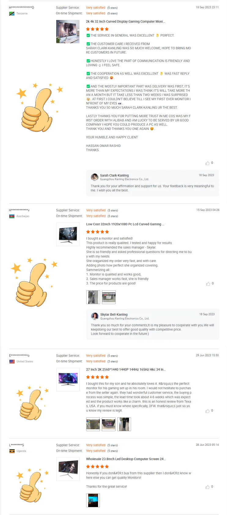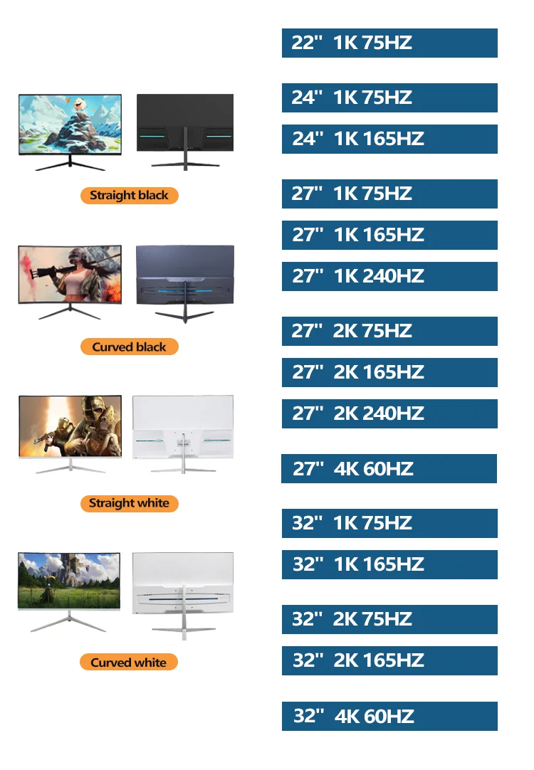 Our factory can provide 20-49-inch monitors with refresh rates of 60Hz-240Hz, and supports logo customization and carton customization.