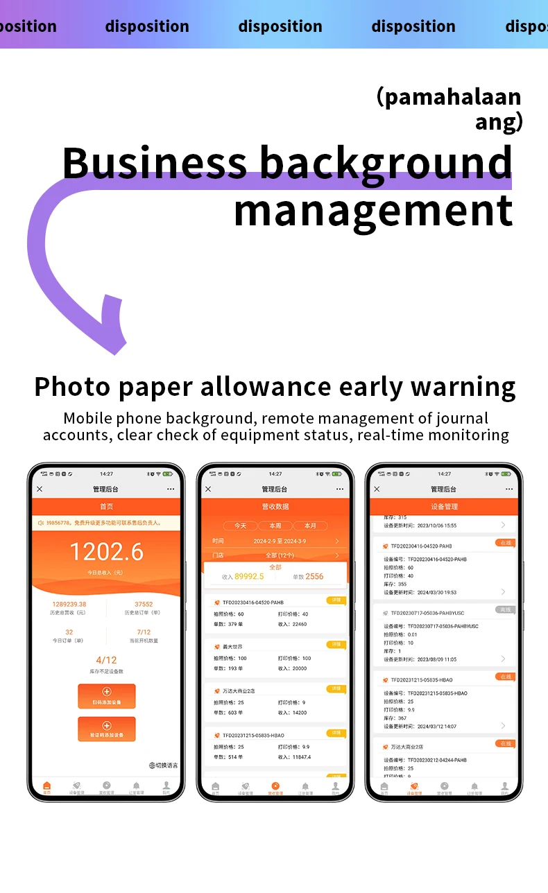 Each device has a corresponding mobile business background, which can view the business data of the day, historical bills, photo paper surplus warning, fault alarm, modify the shooting price, photo time, etc., can be bound to multiple machines at the same time to achieve remote management of multiple sets.