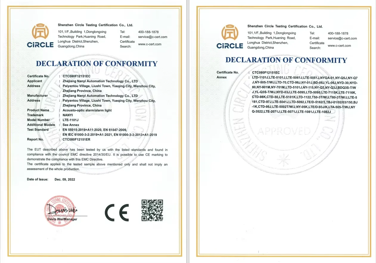 Zhejiang Nanyi Automation Technology Co., Ltd. is located in the reputation of China's electrical capital Liushi, Wenzhou. Is a commitment to industrial LED warning lights, alarms, traffic barrier facilities and other safety equipment research and development and production of emerging backbone enterprises. In recent years, the new increase in the development of hardware products, production and sales continue to improve and expand the company's new business. The company with the understanding of the industry, solid technology, for our customers to provide quality products and perfect service. In the face of rapid development of the market, we will continue to open up, always adhere to the management to create value, service to enhance the advantage, quality first, service to the best concept to go on! 2 The company has a scientific management process for the production of products, and has a number of advanced machines and equipment in the industry to meet the production needs of different customers and different products. At the same time, the workshop has a reasonable partition, fine management to ensure the quality of each product. 3. The company's products have been certified by the authority. Including certification (FCC), Certificate of Conformity (COC), EU CE certification, the pursuit of quality is the concept and purpose of Nanyi. The company develops with market-oriented and diversified business philosophy. Welcome customers to come to buy.