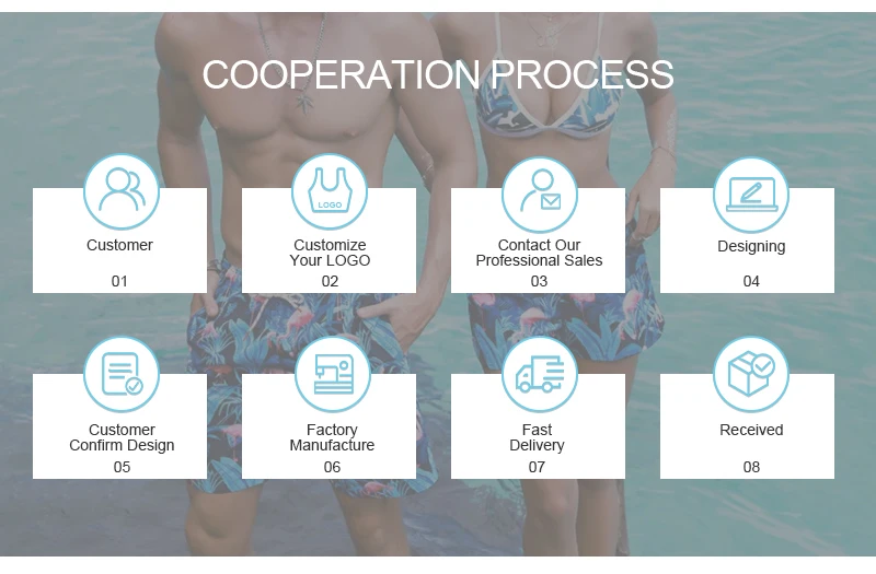 Fabric | 1: 87% Nylon + 13% spandex, 305-315GSM 2: 75% Nylon + 25% spandex, 230GSM 3: 80% Polyester + 20% spandex, 250GSM 4: 75% Polyester + 25% spandex, 210GSM 5: Custom | |||||||