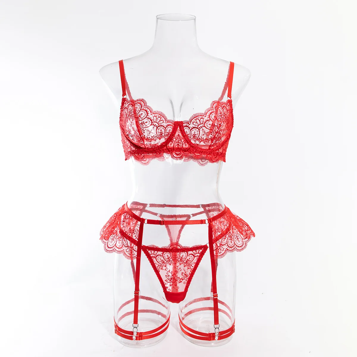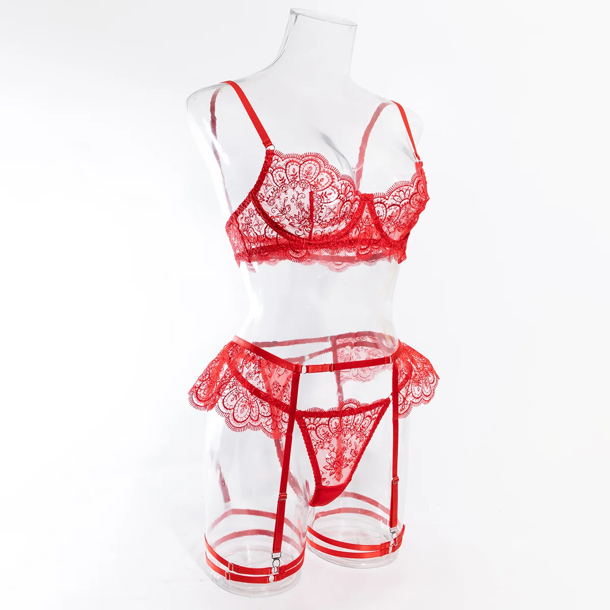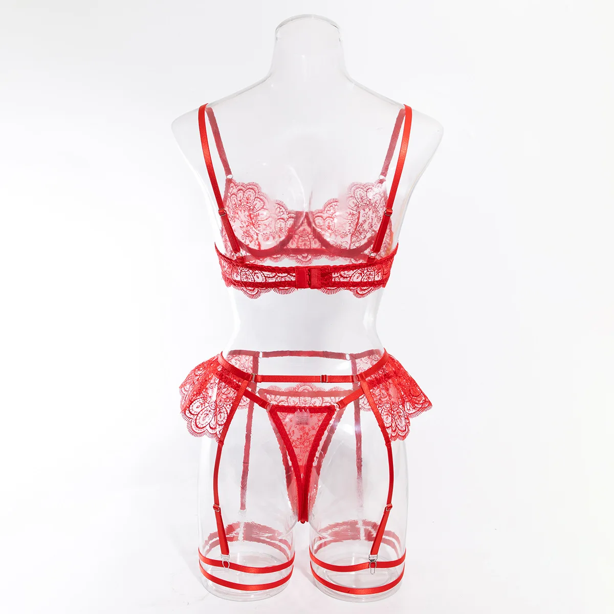 item | Lace Bra Thong Set Women Ultra-Thin Embroidered See-Through Lingerie Four-piece Padded Cups |
