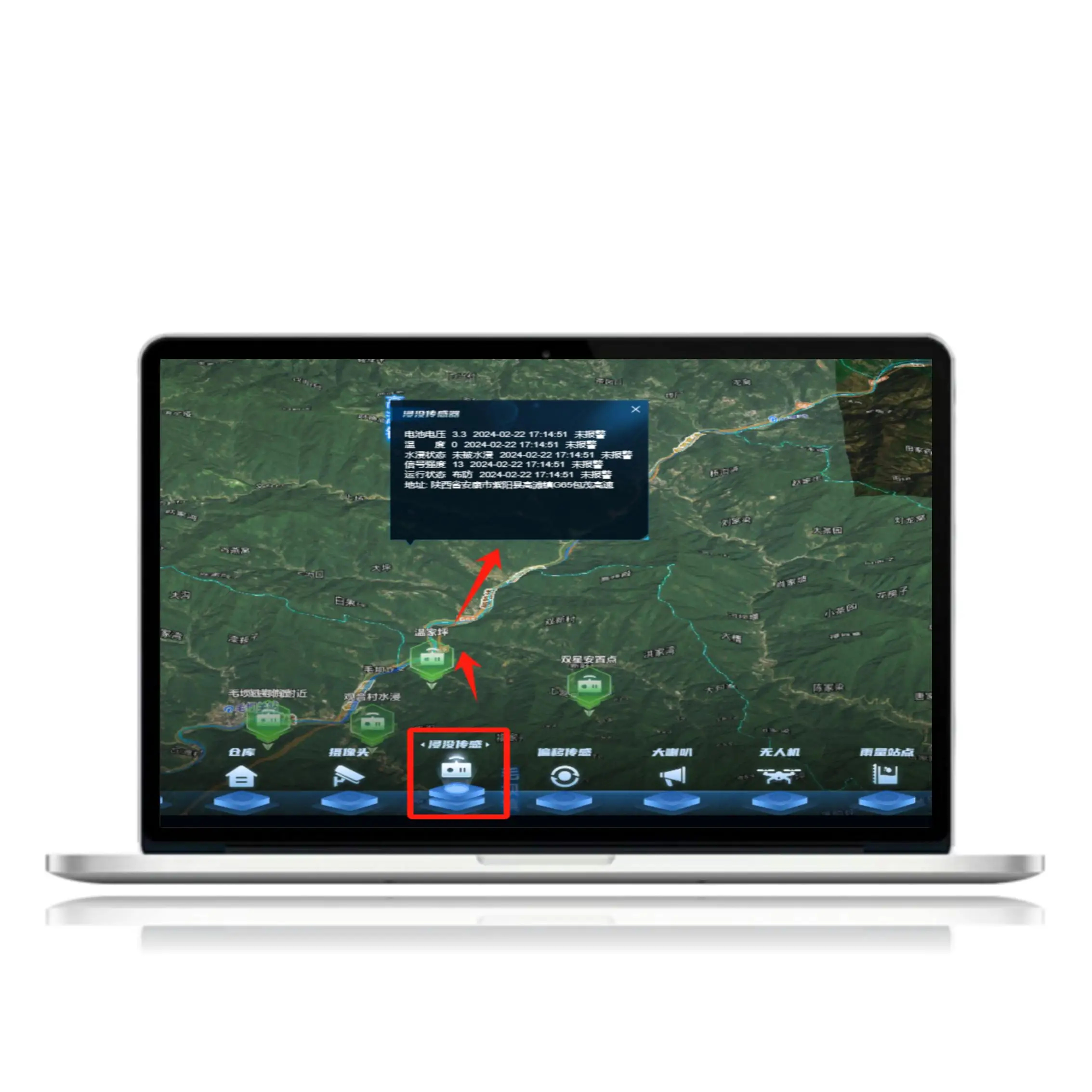 sensor | By clicking on different sensor ICONS, you can view various types of sensors on the map, as well as sensor location, parameter details, etc. | |