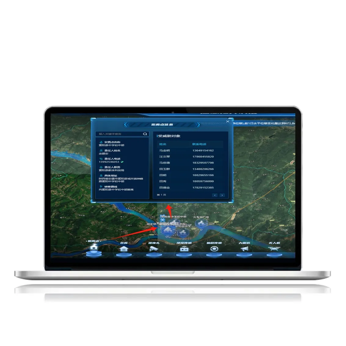 Extraction point | The evacuation point is also called the safety point, when the disaster occurs, the threatened people can be evacuated to the evacuation point through the safe evacuation route. You can view the location of the evacuation point, the person responsible, the contact information, and the details of the threatened object |