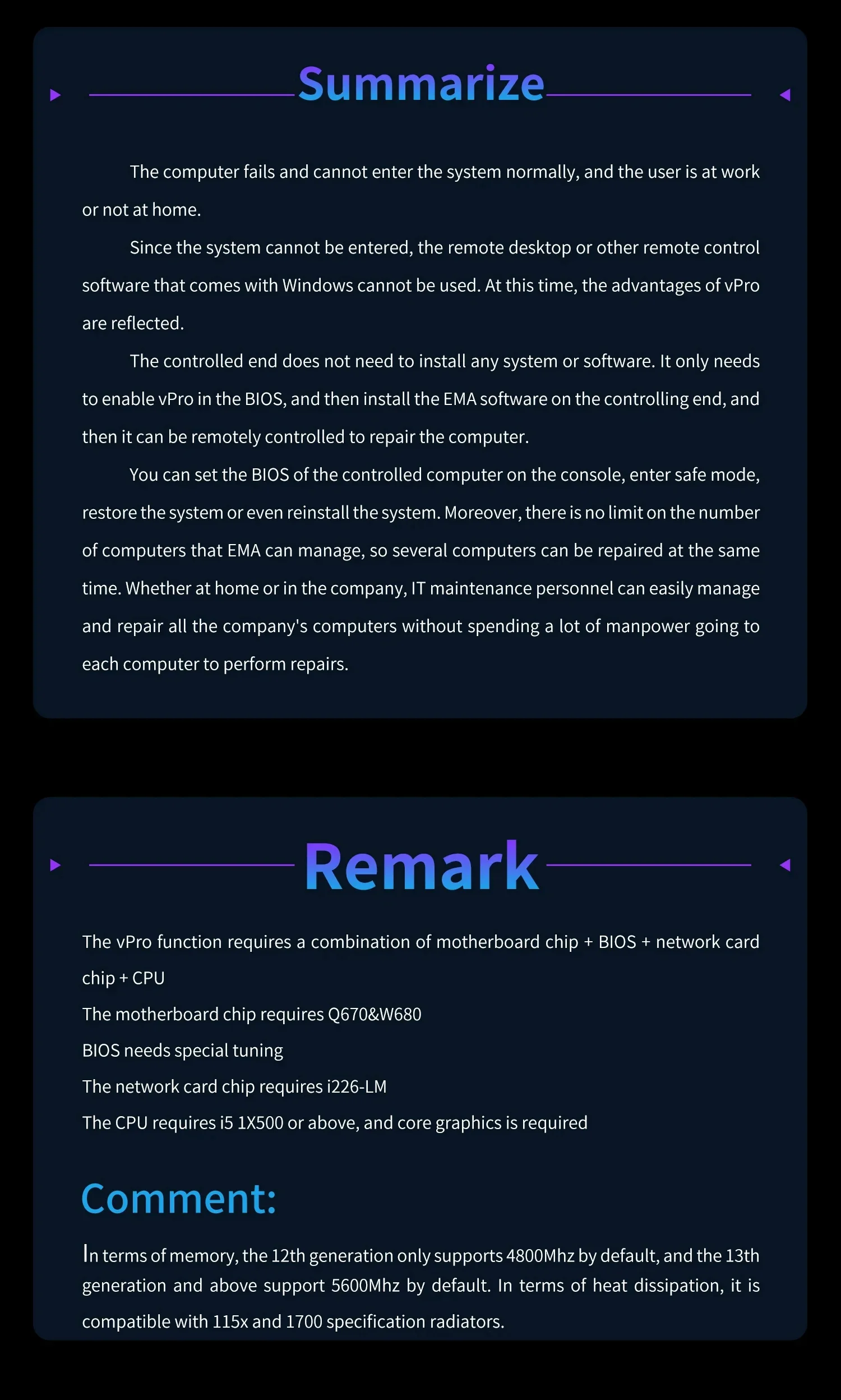 1. Must work with a good 115X radiator, please buy bundle with radiator if you do not have. 2. Must connect 24pins+8pins ATX 12V power supply at the same time to power on. 3. Do not use intel F series CPU because it is lack of intel integrated graphic, can not display! Suggest to use Intel 1X500T and above LGA1700 series CPU for intel vPro! 4. Every new motherboard was tested with radiator totally before shipping, that is why copper plate seems to get traces of thermal grease.