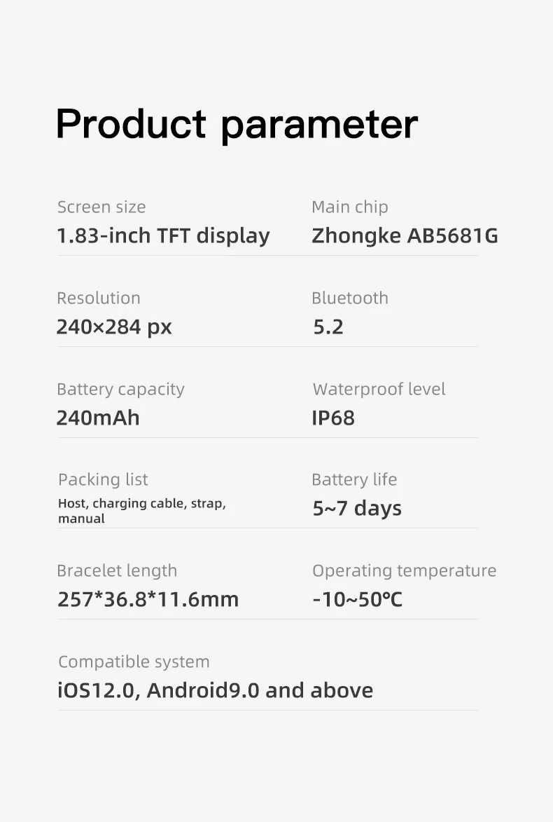 System | Android 8.0 and above, IOS 10.0 and above, supporting Bluetooth 5.2 | |