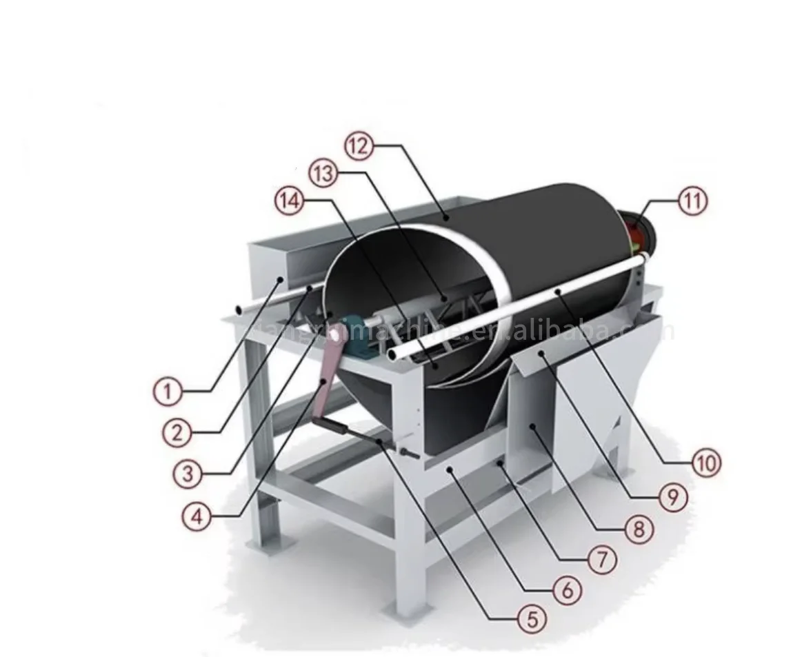 Model | Diameter (mm) | Tube length(mm) | Rotational speed(r/min) | Feeding size(mm) | Capacity (t/h) | Motor power(kw) |