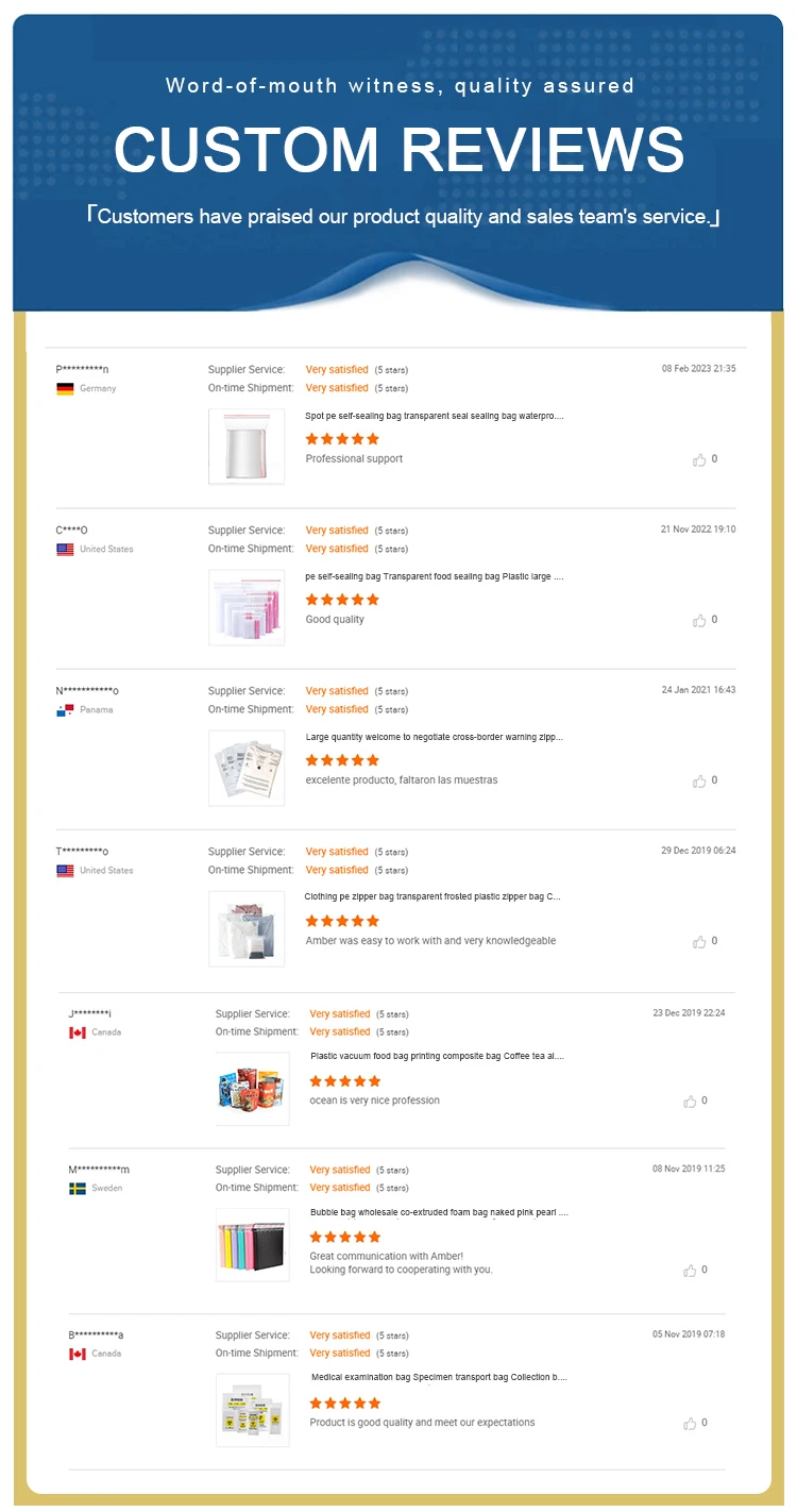 Feature | Waterproof, tide proof, air proof and non-poisonous reclosable poly bag | |