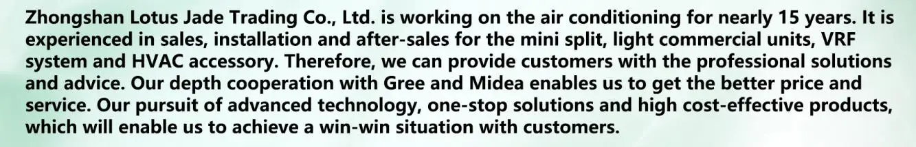1. We specialize in air conditioning for up to 15 years, in-depth cooperation with suppliers, products with high Cost-effective and better customer service. 2. With overseas warehouses, a stable quantity of stock can reduce the risk of customers hoarding goods; We have a cooperative freight forwarder, and the transportation is faster, which can effectively shorten the delivery time. 3. Understand the pain points of the air-conditioning industry, clearly grasp customer needs, familiar with product features, and can propose more suitable solutions to customers. 4. There is a very complete range of air-conditioning accessories, from installation to maintenance can be one-stop shopping.