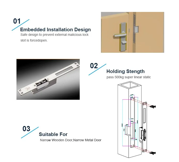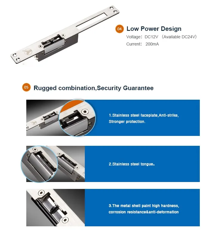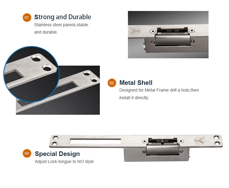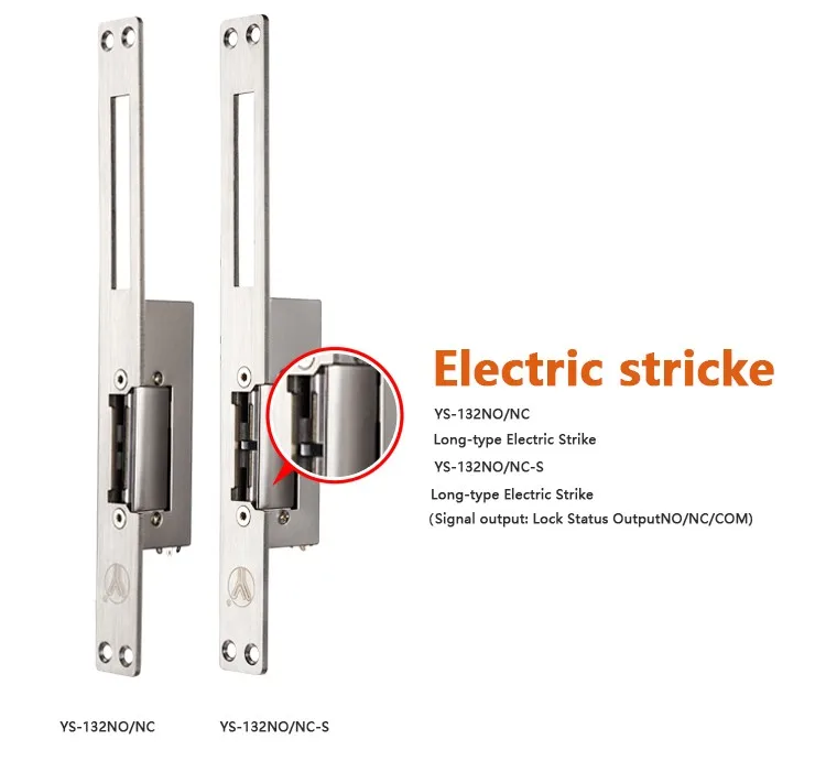 Electric strikes come in many varieties.YS-132NO/NC-S is the electric strike with long faceplate and signal output. It has two modes: A fail safe electric strike needs power to keep it locked. A fail secure electric strike stays locked even without power.