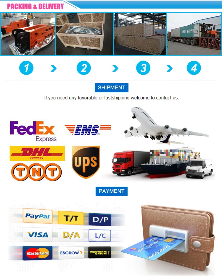 1.What color can you produce ? Red.If you need special, please advise. 2.How about the delivery time ? Within 7-10 working days after receiving T/T payment. 3.What’s the MOQ and payment ? MOQ is 1 set. T/T, L/C, Escrow, west union is accepted. and other terms can also be negotiated. 4.Are you a manufacture? Yes, our factory was established in 2003. 5.Can you produce according to customers’ design? Sure,we are professional manufacturer,OEM is available. 6.Which country have you exported? Canada, Australia, Peru, Egypt, Brazil, Mexico, South Africa,etc. 7: Are you sure that your product will fit my excavator? Our breakers can be adapted to different excavators. Show me your model number, and we can give you best solution. 8.How about the package? Standard export package, plywood cases, or as customers' demands.