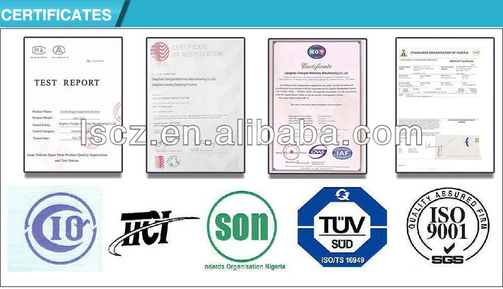 Liangshan Changzai Machinery Manufacturing CO., Ltd. is located in Liang Shan County, which is Chinese trailer (special-use vehicle) production base.we specialized in manufacturing trailer accessories more than ten years, including Trailer Axle, Suspension System,Break Chamber, Landing Gear, Fifth Wheel, King Pin,Brake Drum, Twist Lock, Slack Adjuster, Air Tank, Rim, Cap, Leaf Spring, ABS, Modulators, Brake Shoe etc. Every mouth, we send over ten containers to all over the world and make a difference in this field, as we could offer the best quality and price for our customer.The products we supply could lower your cost,improve your competitiveness,and get more customer. We sincerely hope to make long-long cooperation with you.