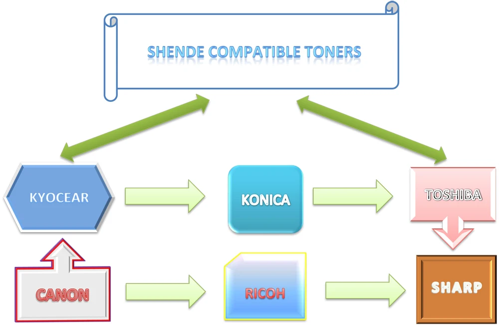 As a professional manufacturer and exporter in printer and copier consumables , we own more than 10 years experience on production .Our core competencies are toners of CANON, RICOH, TOSHIBA, KONICA,MINOLTA, KYOCERA & SHARP. We always make environmental friendly and high quality items according to ISO 9 0 0 1 standard ,because we believe that "Quality is the soul of an enterprise "!