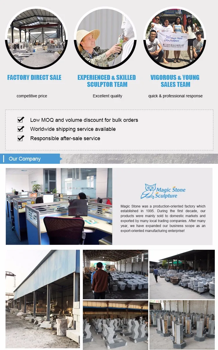 Magic Stone owns two factories which are located in Quanzhou city. Besides, we cooperate with another three factories in North of China, to provide wide range of stone sculptures for clients, thus competitive price and high standard quality can be ensured. Magic Stone are especially professional in produce stone garden birdbath, animal ornaments, water fountains, basalt garden landscapes, etc.